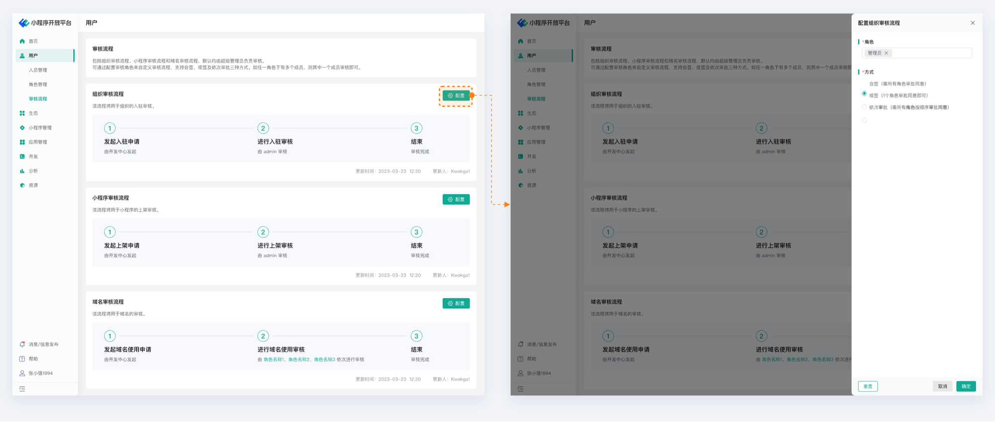 In FinClip Cloud, the designed audit flow supports different organizations to configure co-signature, or signature, and process signature mechanisms according to management needs.
