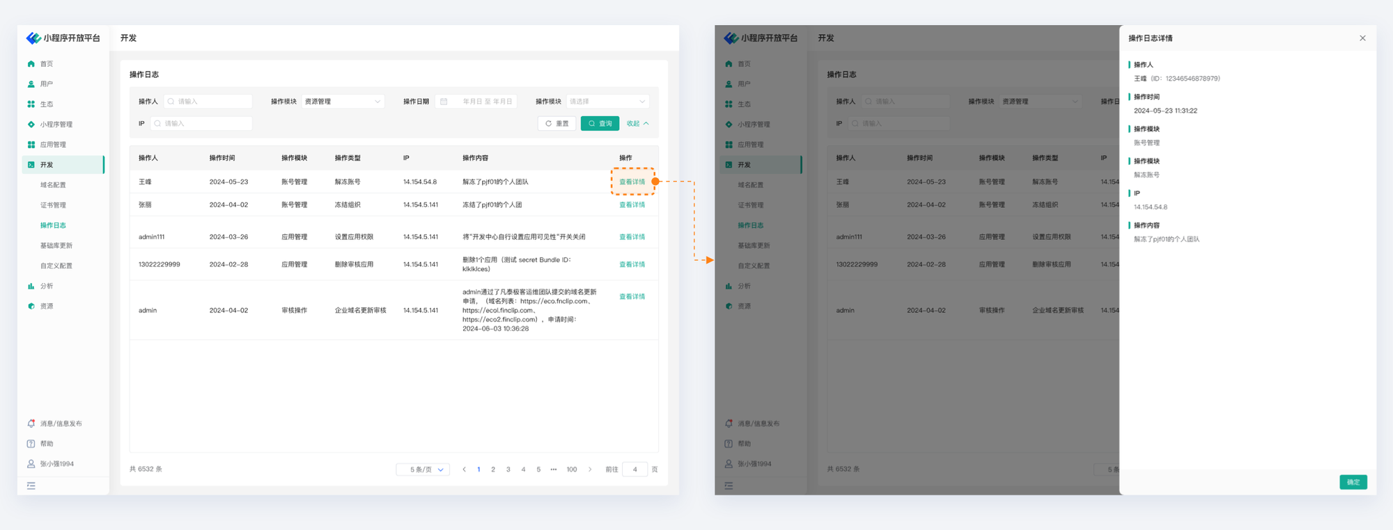 Administrators can view detailed operation history according to the operation module. Developers have left detailed operation records for the mini-program and application layer operations, which can better serve team supervision and compliance processes.
