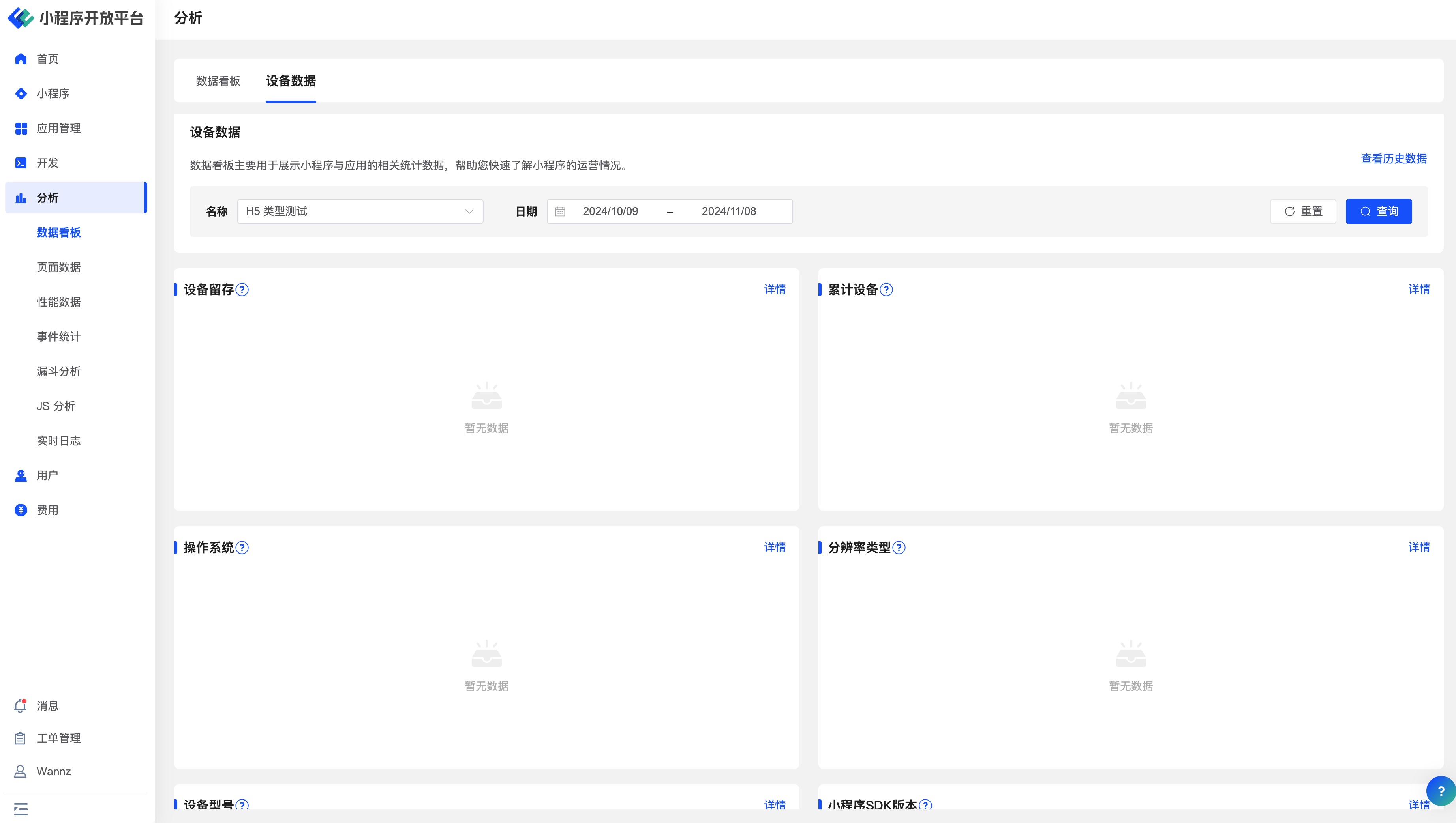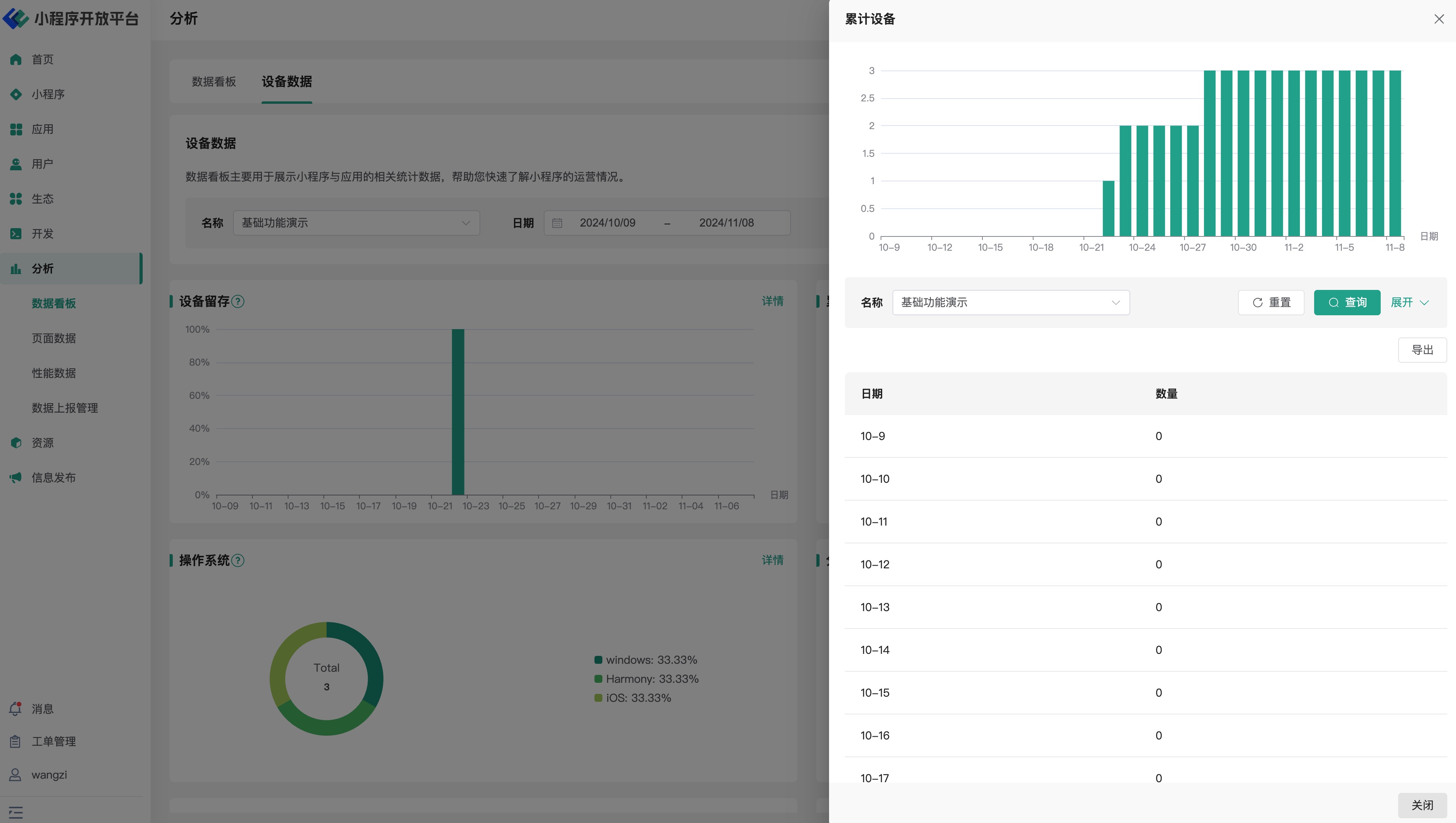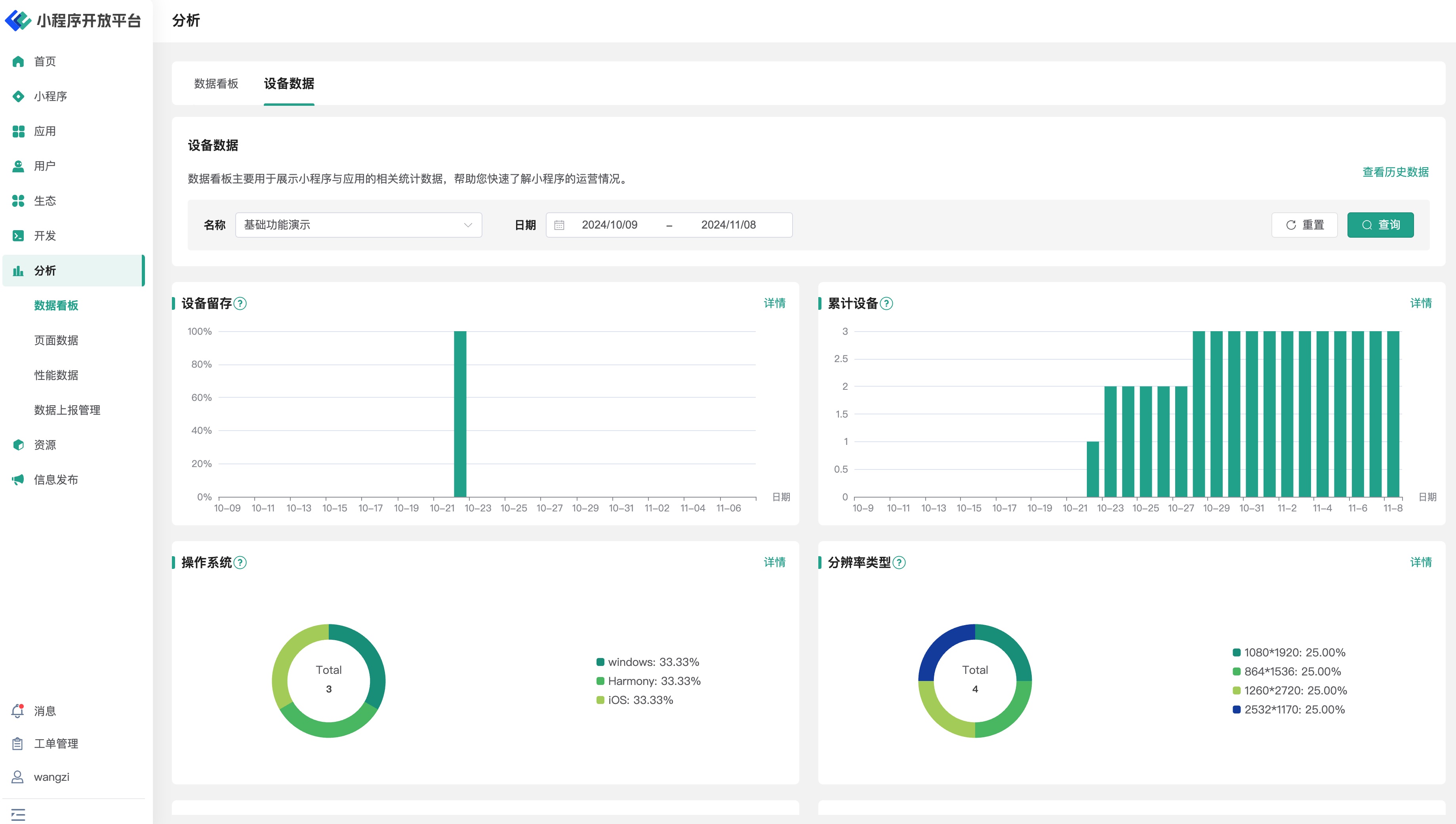 在数据看板页面中,还可以点击顶部的切换选项卡,查看基于不同小程序的设备数据信息。