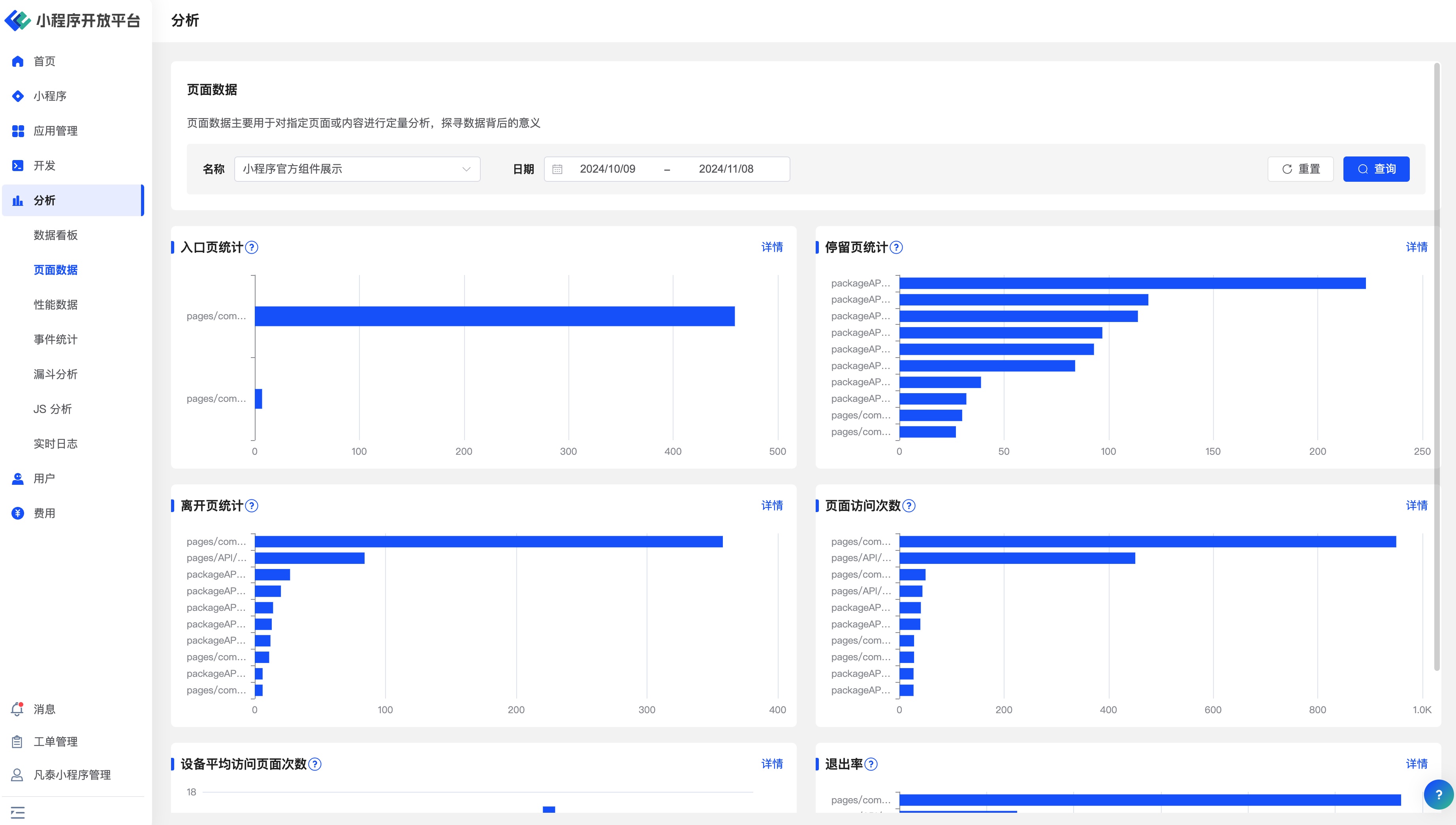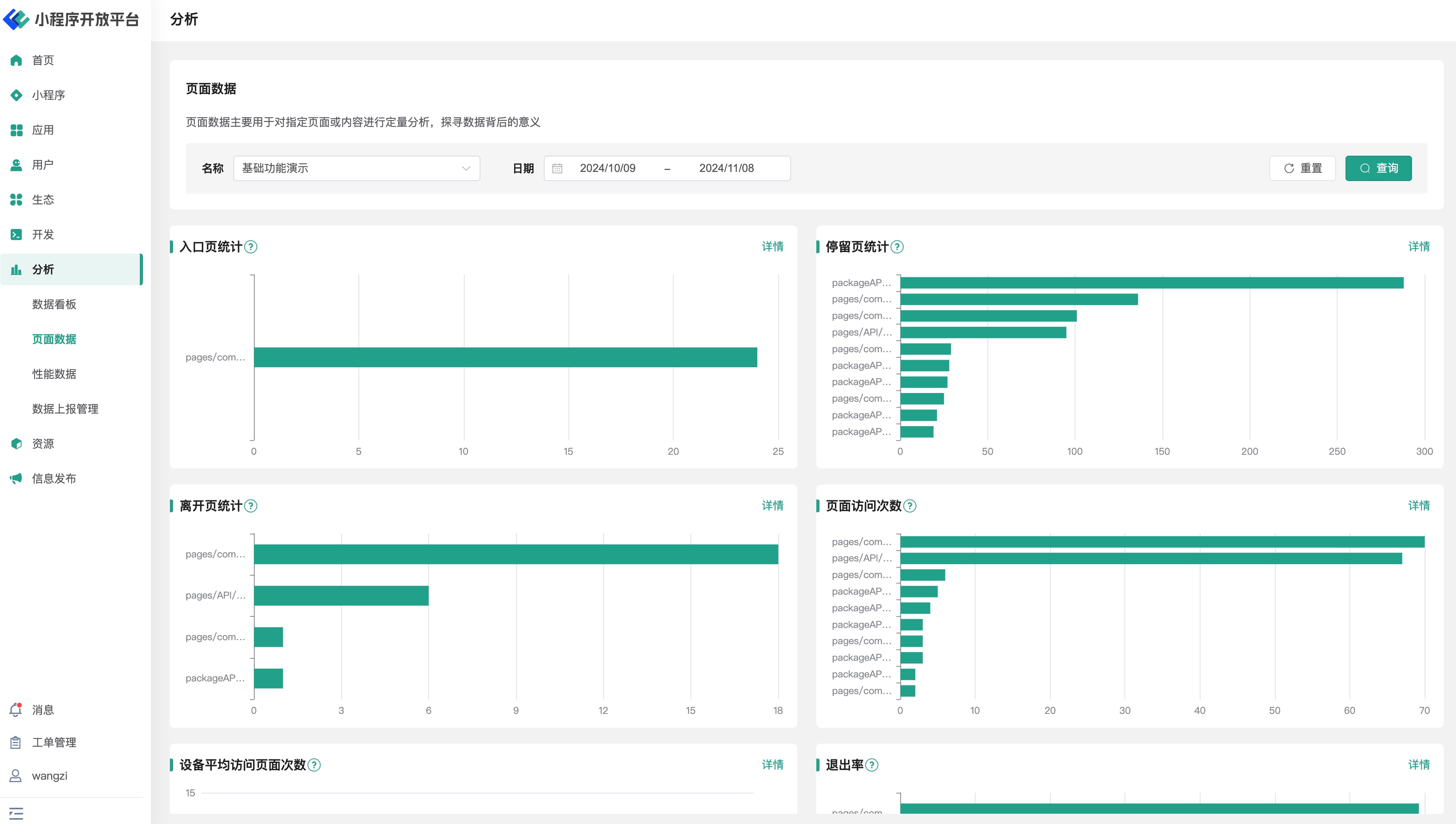 - 停留页统计:统计时间内,用户进入小程序停留时间从高到低数,从高到低排序;