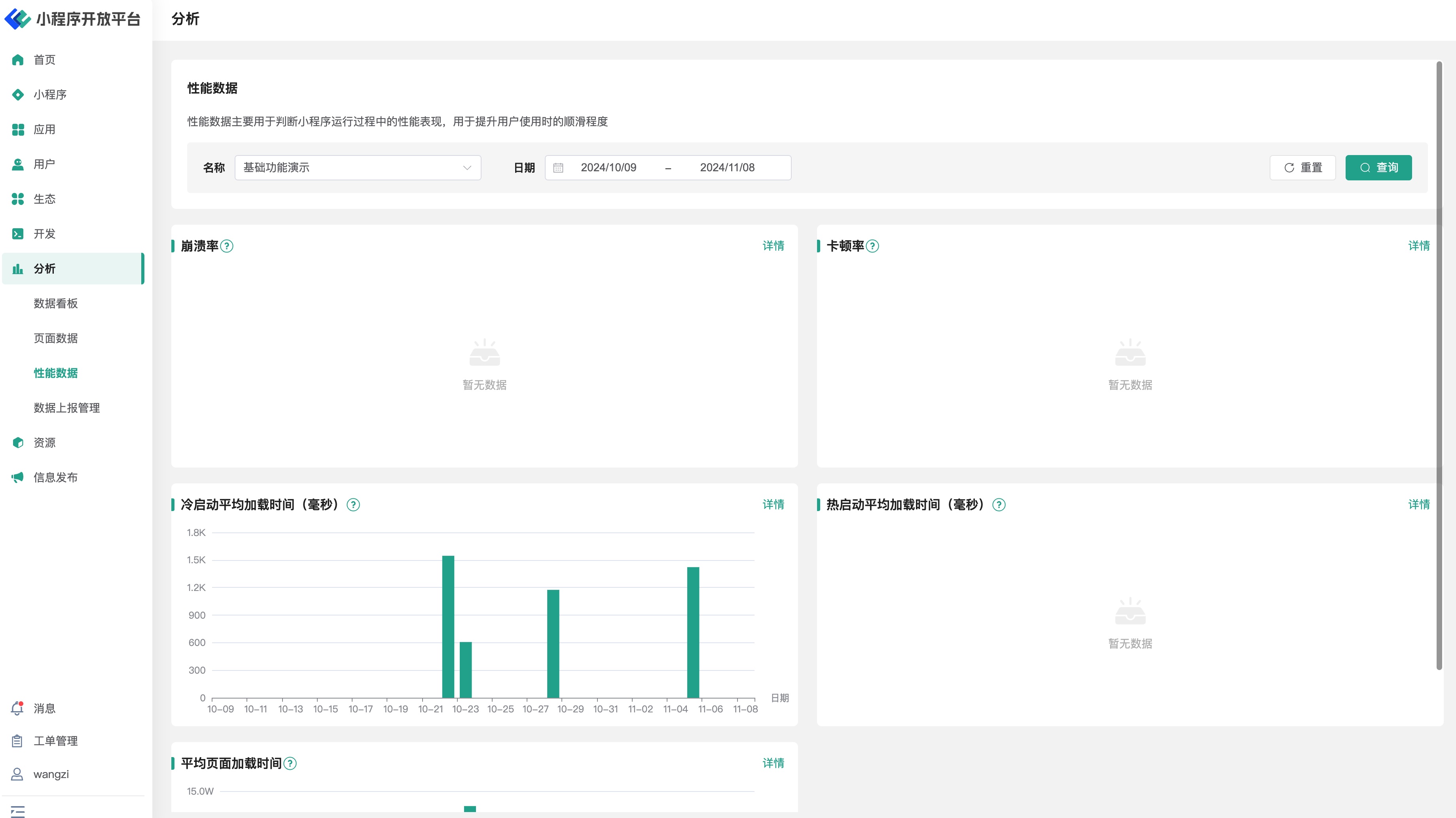 | 性能数据 | 性能数据统计模块监控小程序的加载时间、响应速度和其他关键性能指标。通过分析这些数据,用户可以识别性能瓶颈,优化代码和资源配置,从而提高小程序的响应速度和稳定性。性能数据模块为用户提供了实时的性能监控和报警功能,确保小程序在各种网络和设备条件下都能提供良好的用户体验。 |