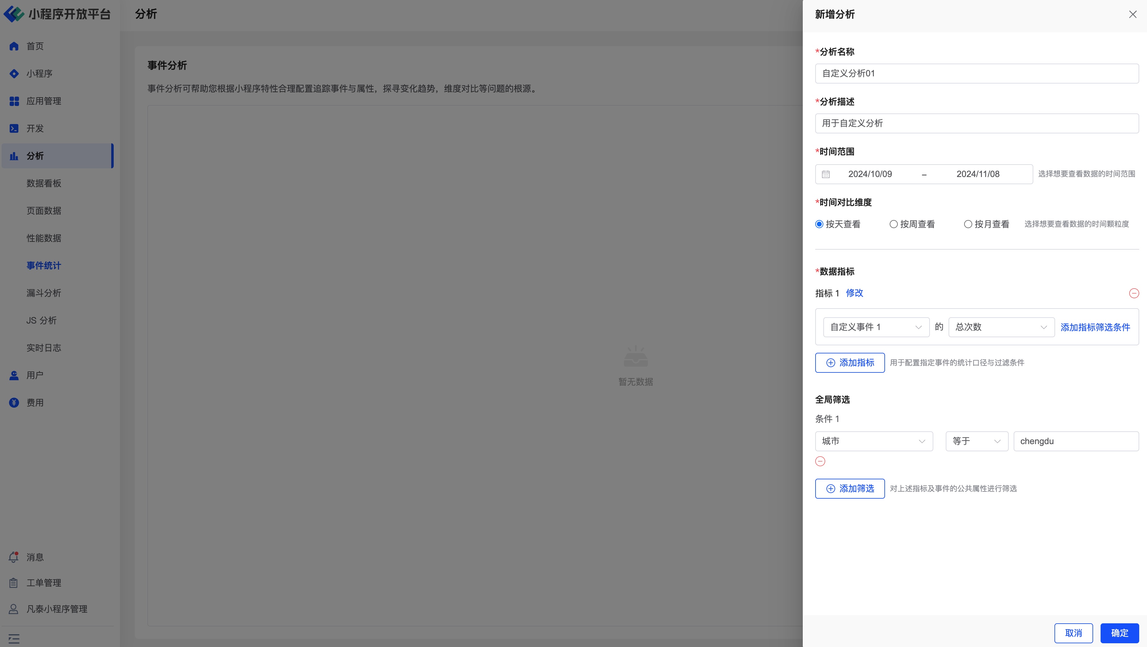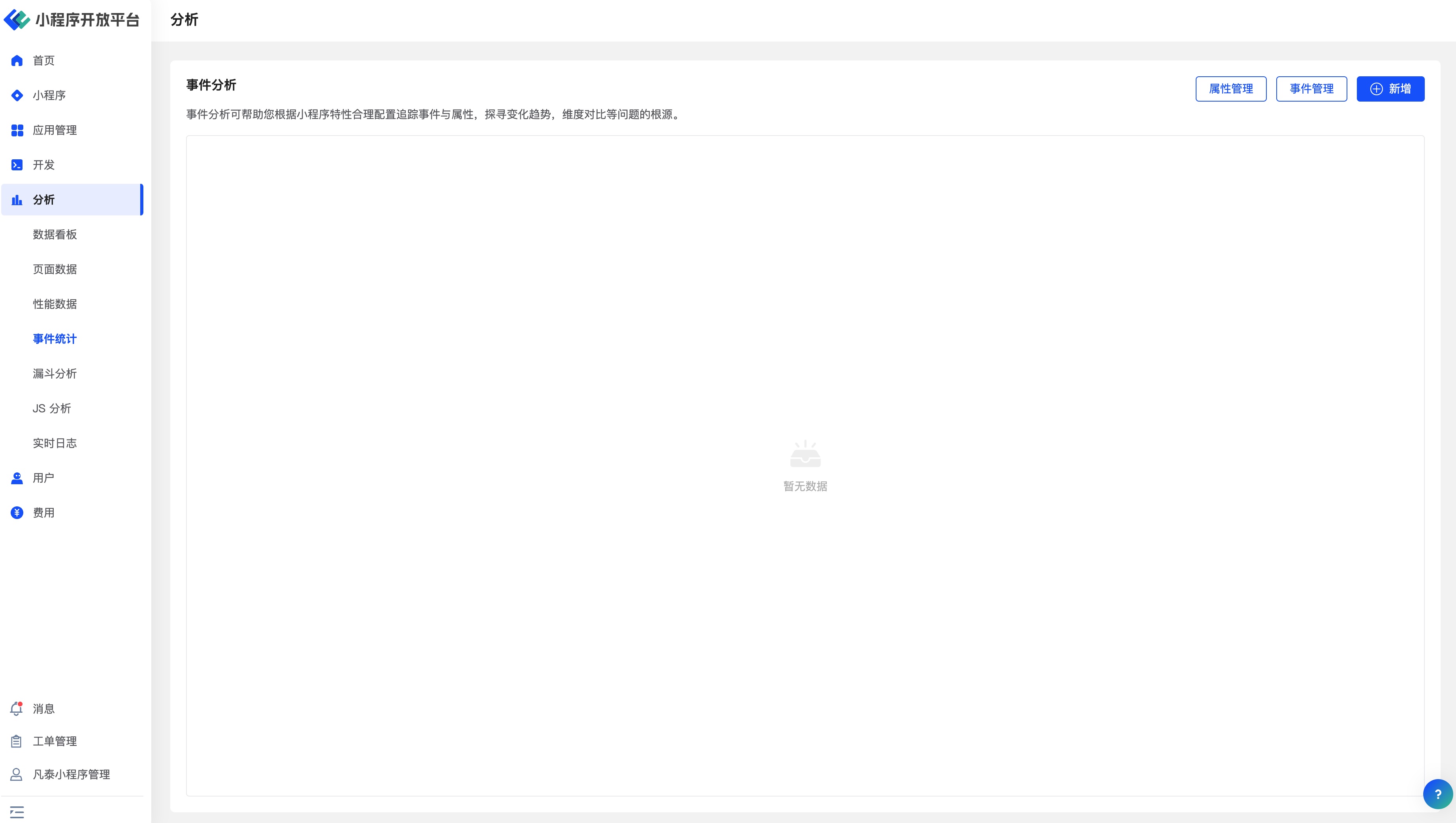 | 事件统计 | 事件统计模块允许开发者跟踪用户在小程序内触发的特定事件,如按钮点击、表单提交等。通过分析这些事件的发生频率和相关用户行为,开发者可以更好地理解用户的需求和偏好,进而优化功能设计和提高用户参与度(该功能属于高级版统计分析功能。 |