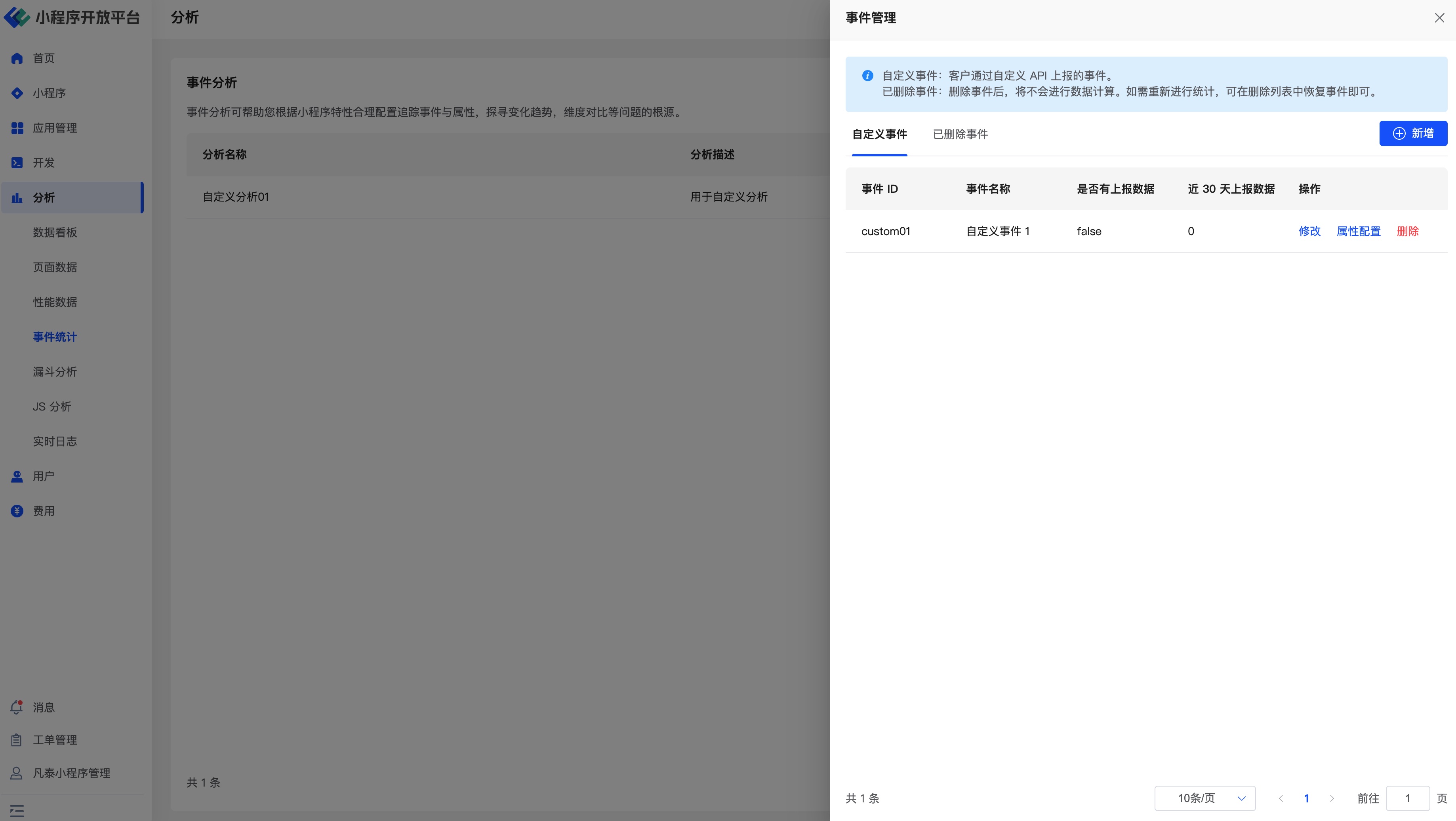 FinClip 小程序统计功能支持用户按照自身实际业务需求,在小程序中上报对应的事件与属性。以满足更加灵活的数据统计需求。一个事件可以由单个或多个属性组成,我们需要分别录入组成属性的“属性 ID”,“属性名称”与“属性类型”,随后再录入事件以及配置事件属性。