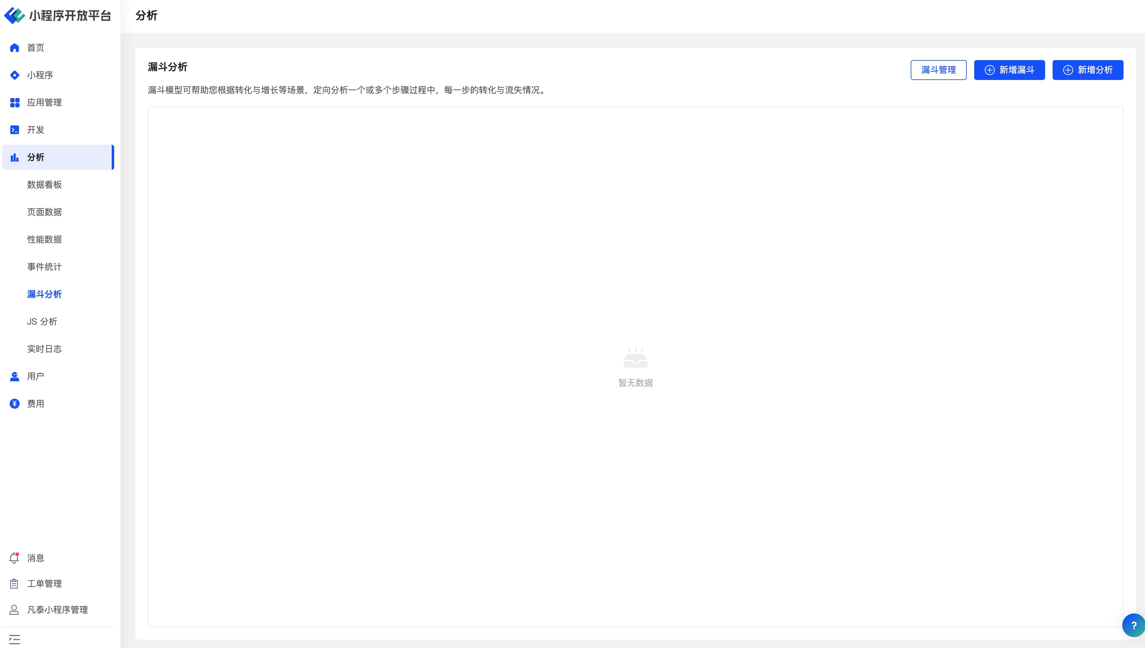 | 漏斗分析 | 漏斗分析模块专注于转化路径的分析,它帮助开发者了解用户从进入小程序到完成特定目标(如购买、注册)的转化过程。通过分析转化漏斗的各个阶段,开发者可以识别用户流失的环节,采取相应措施提高转化率(该功能属于高级版统计分析功能)。 |