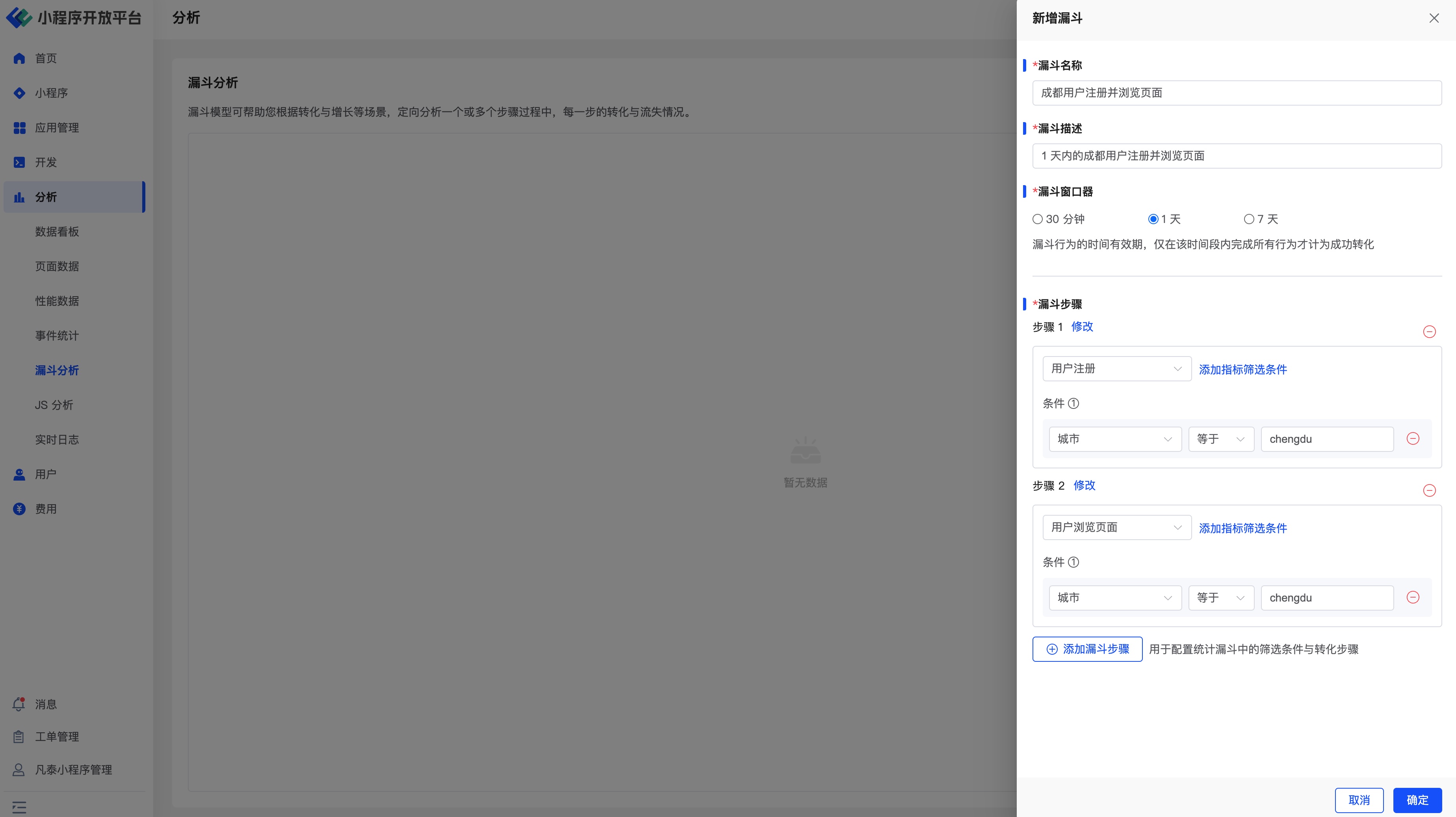 如上图所示,我们可以分别配置对应的事件,并按照对应的筛选效果完成诸如“成都用户在 1 天内完成注册并浏览页面”的统计漏斗。随后将对应的漏斗配置为对应的分析即可。