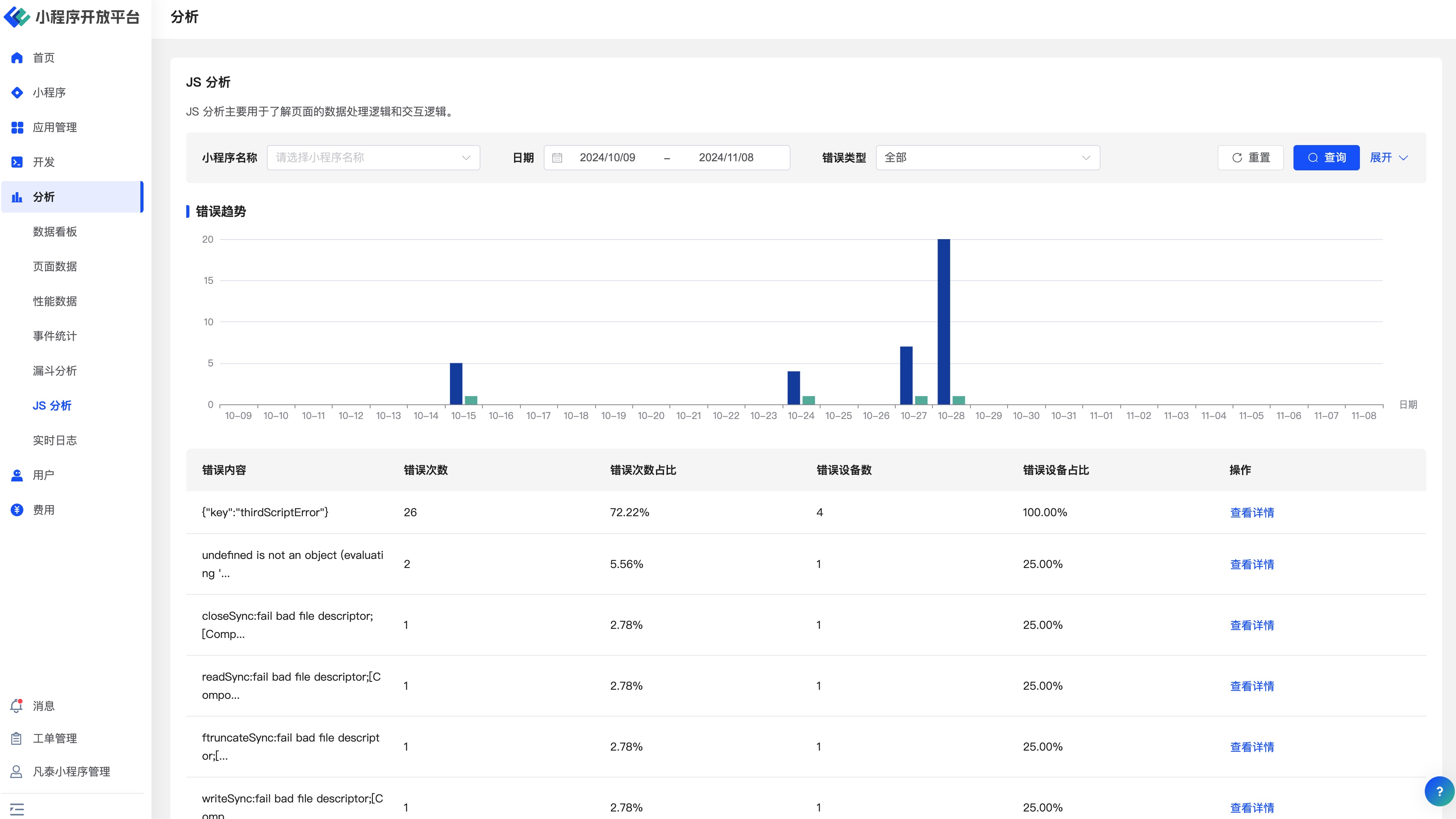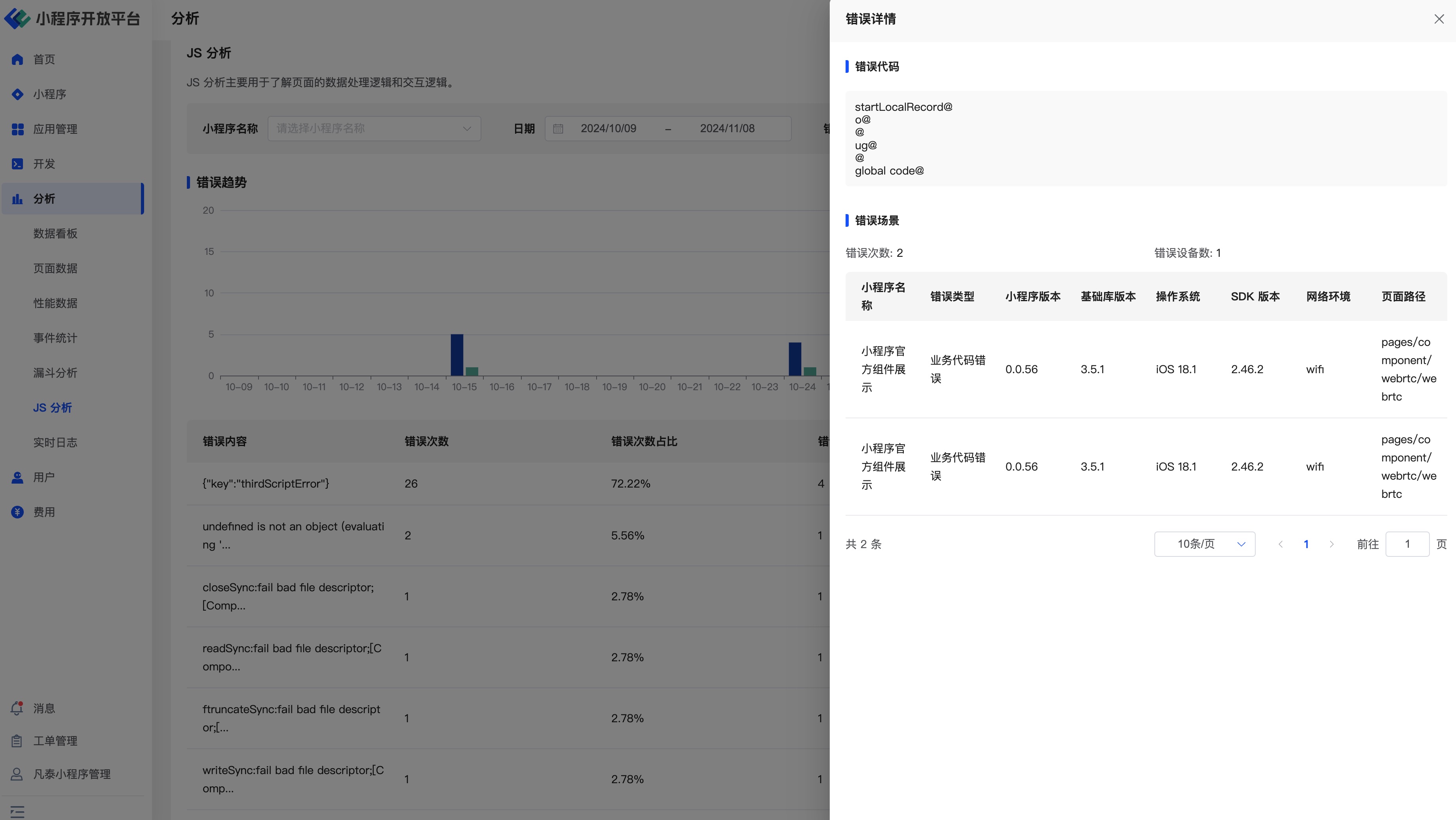 | JS 分析 | JS分析模块专注于监控小程序中的JavaScript代码执行情况。它可以帮助开发者识别脚本错误、性能问题和资源加载问题,从而优化代码和提高小程序的稳定性和响应速度(该功能属于高级版统计分析功能)。 |