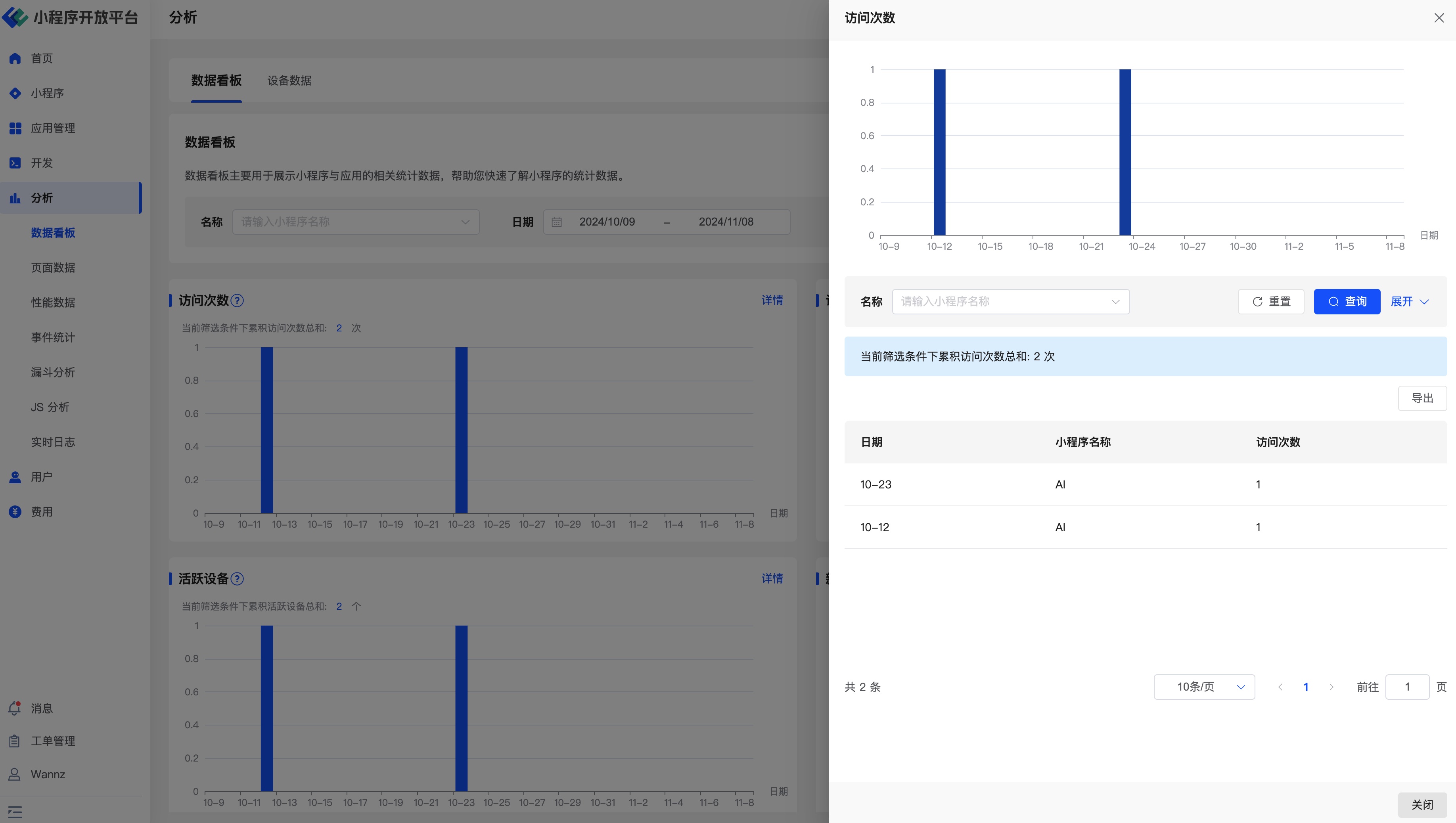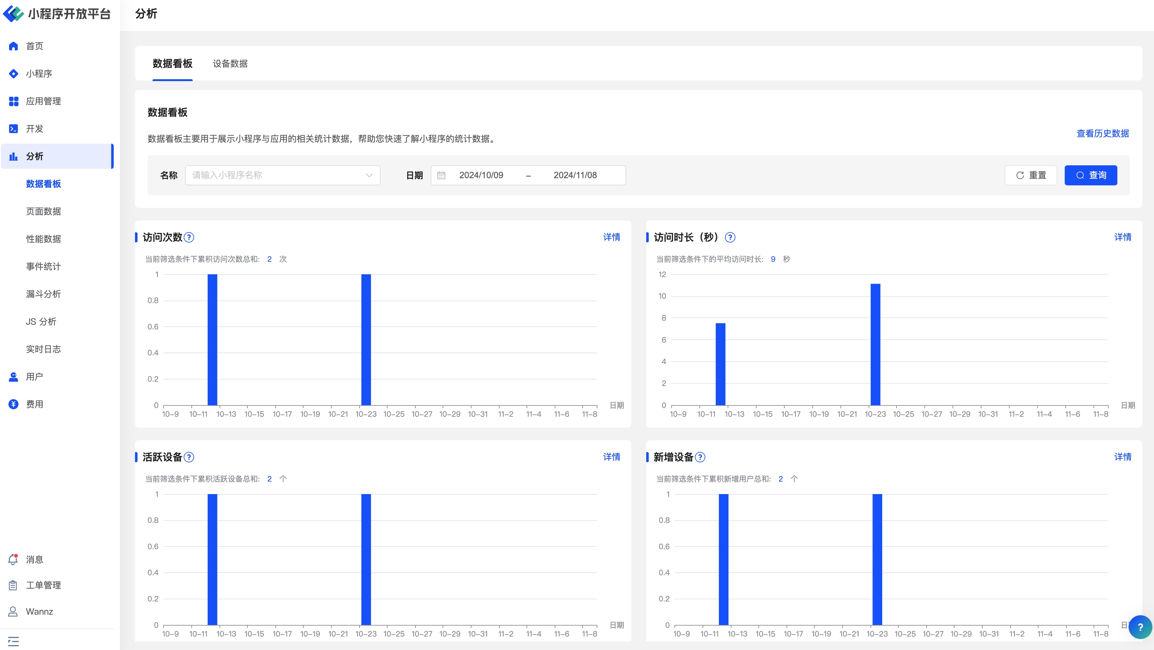 数据看板模块为用户提供了一个集中展示关键性能指标(KPIs)的界面。页面中可看到所有小程序汇总或按照小程序与时间筛选的核心数据。