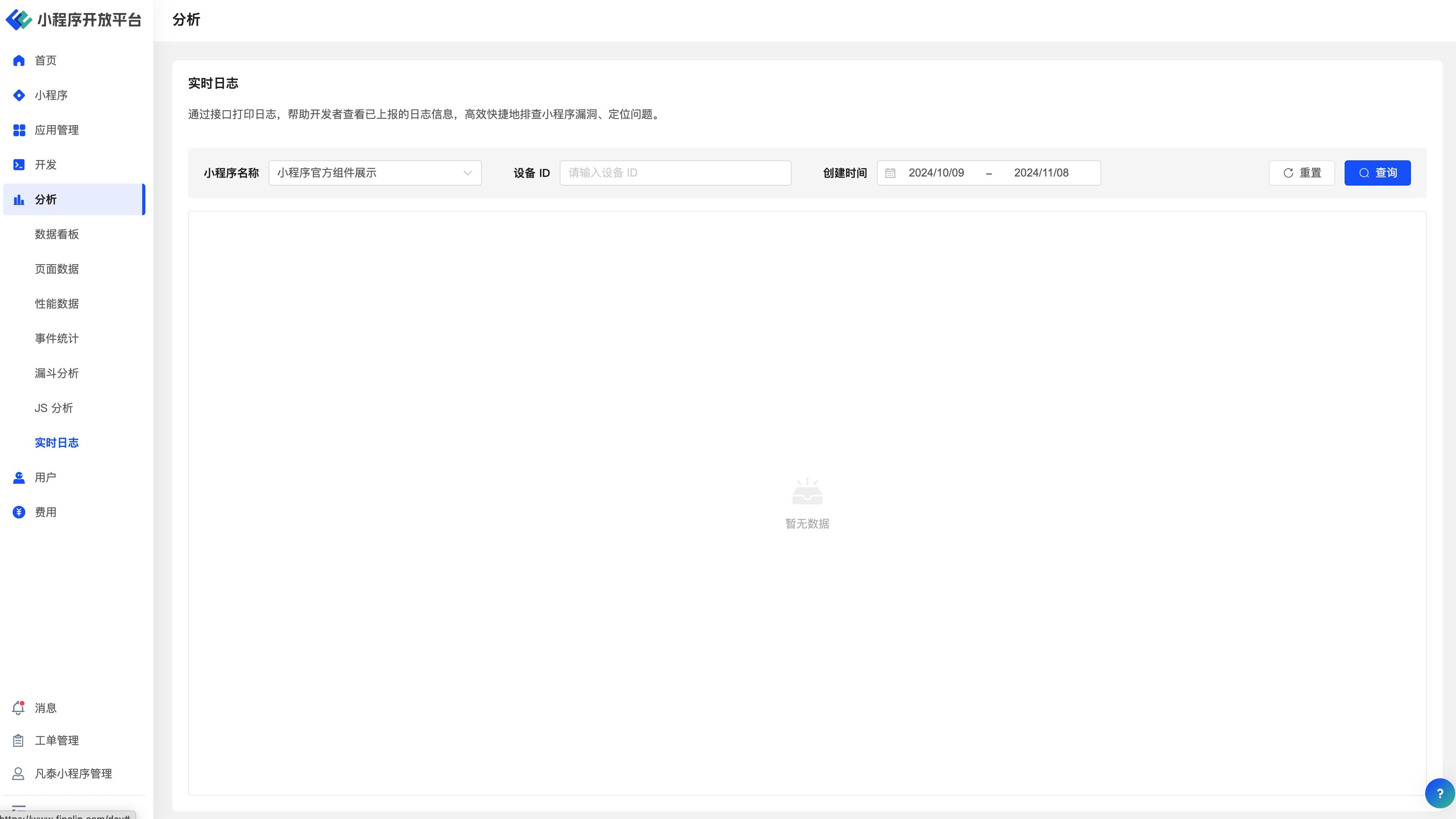 | 实时日志 | 实时日志模块提供了一个实时监控小程序运行状态的窗口。开发者可以通过这个模块查看用户的操作日志、系统错误和其他关键事件,以便快速响应和解决可能出现的问题。实时日志对于快速定位和修复问题至关重要(该功能属于高级版统计分析功能)。 |