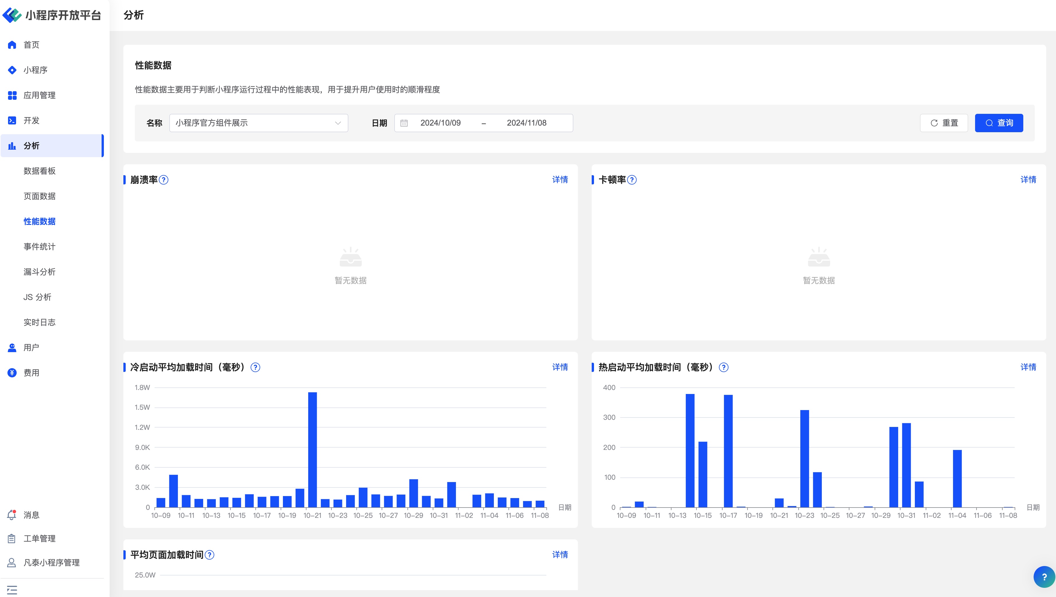 - 平均页面加载时间:小程序所有页面加载的平均时间。