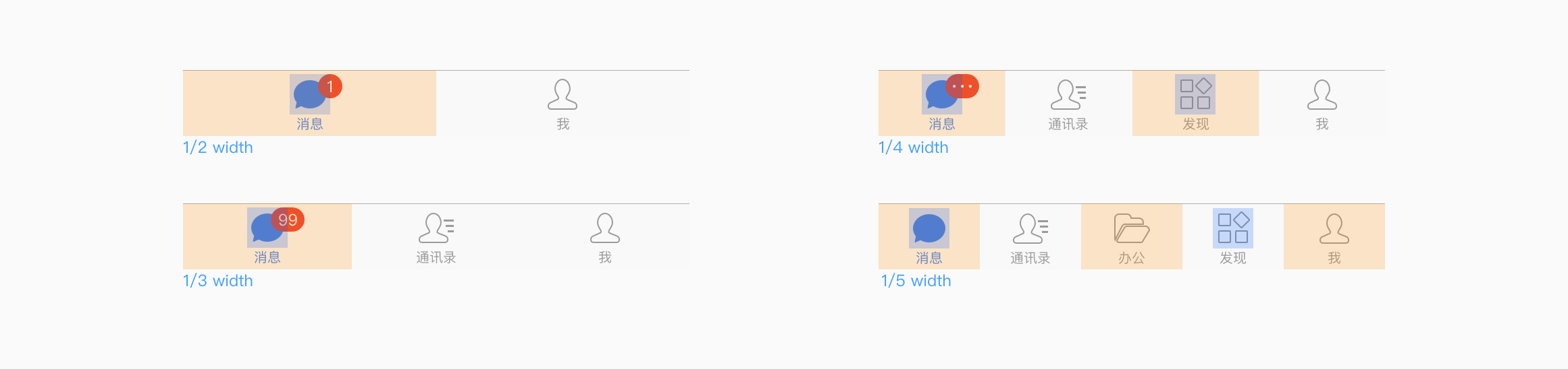 一般固定于底部,作不同分页入口。标签数不少于 2 个,最多不超过 5 个。
