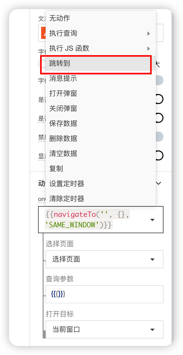 该事件允许用户在应用程序的内部页面或外部URL之间导航。它可以在任何小部件操作上触发,如Button的onClick, Dropdown的onOptionChange等。在navigateTo函数中输入页面名称或外部URL(在onClick等触发操作下),如果需要,输入Query参数,并为新页面(新窗口或相同窗口)选择目的地。