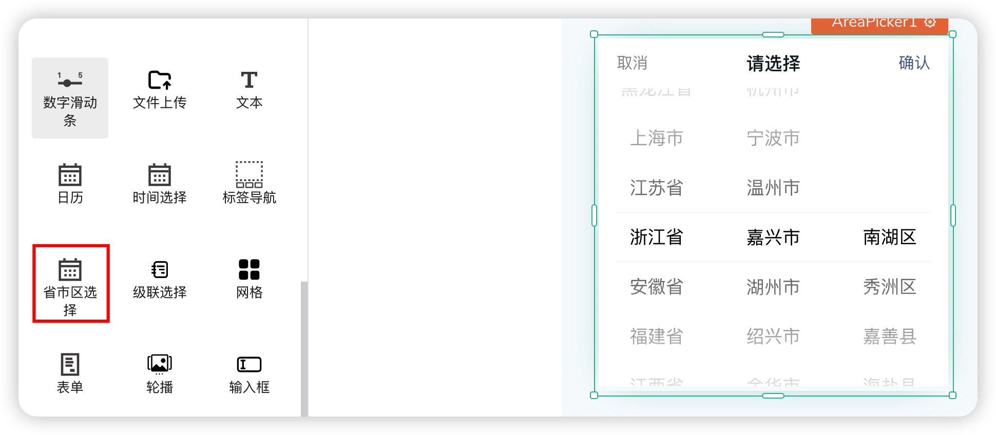 级联选择框,用于多层级数据的选择,典型场景为省市区选择。