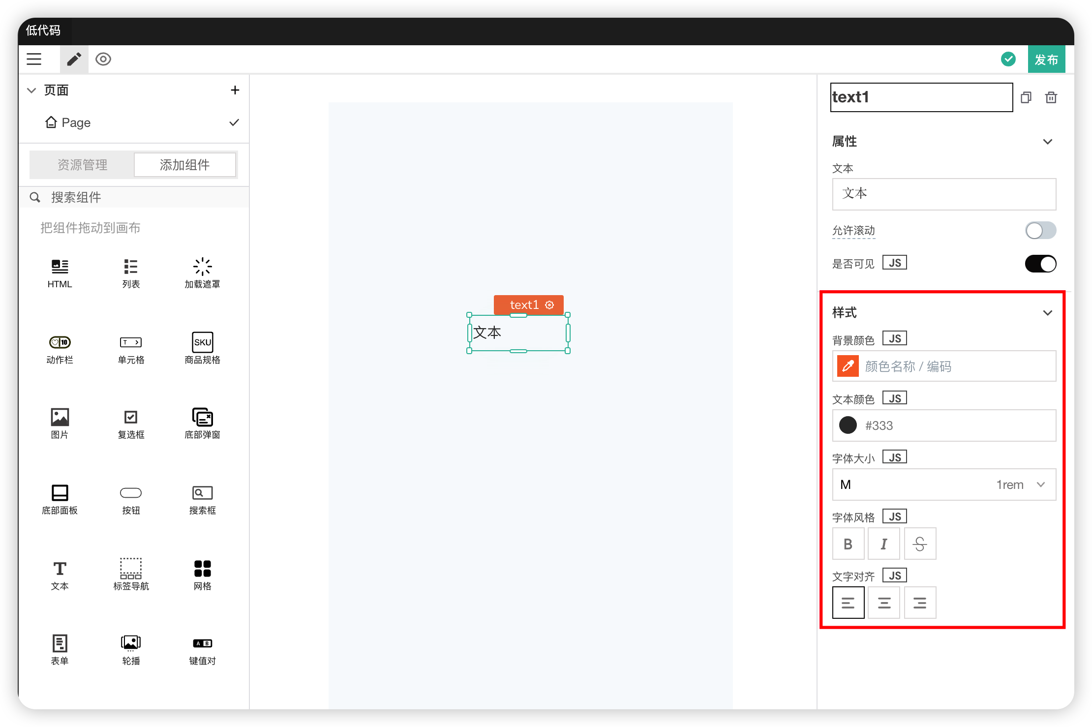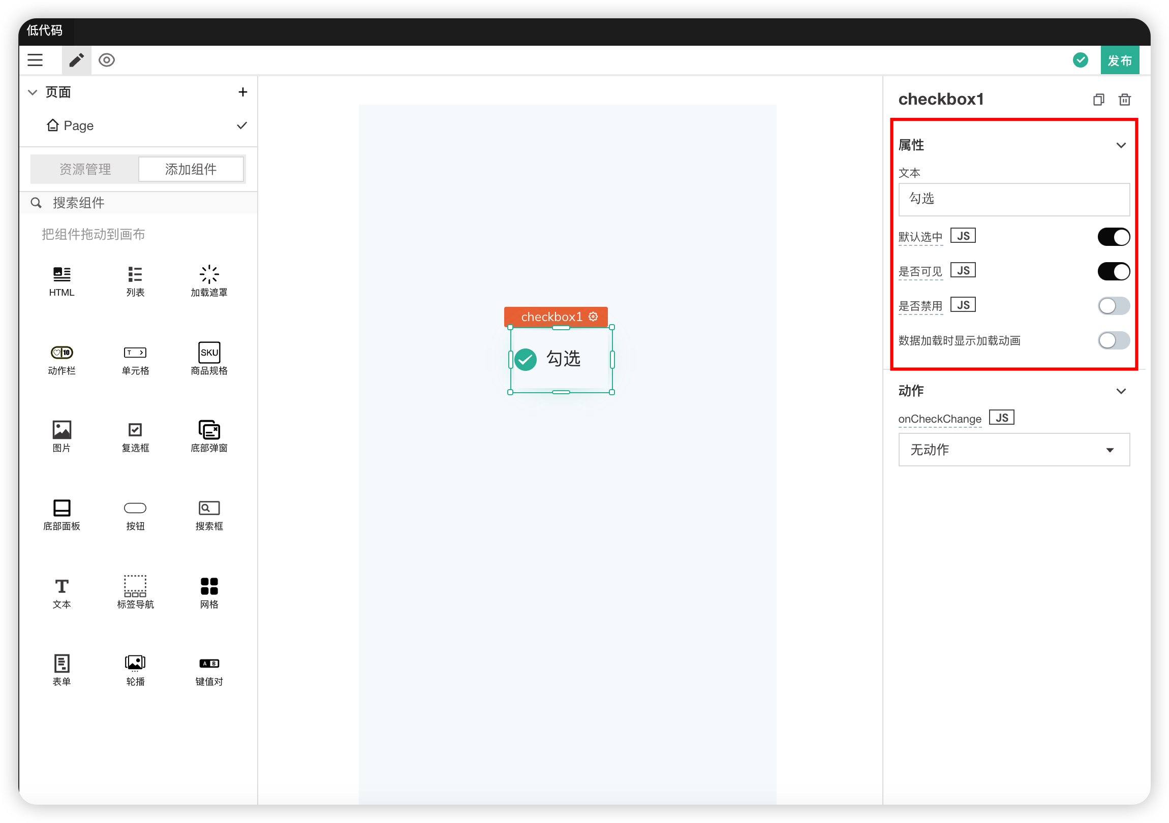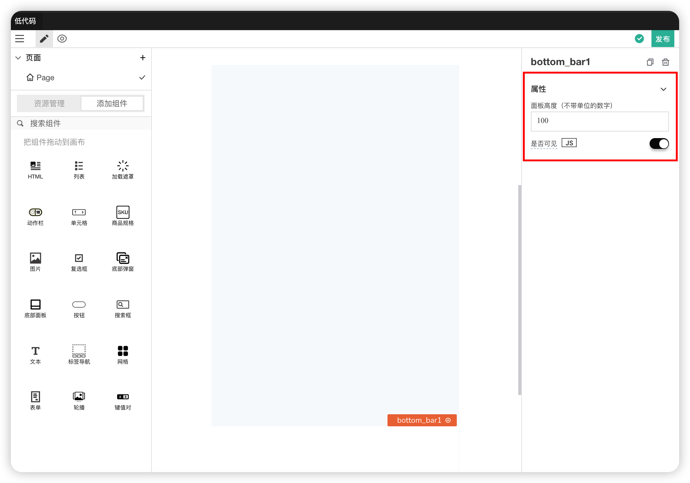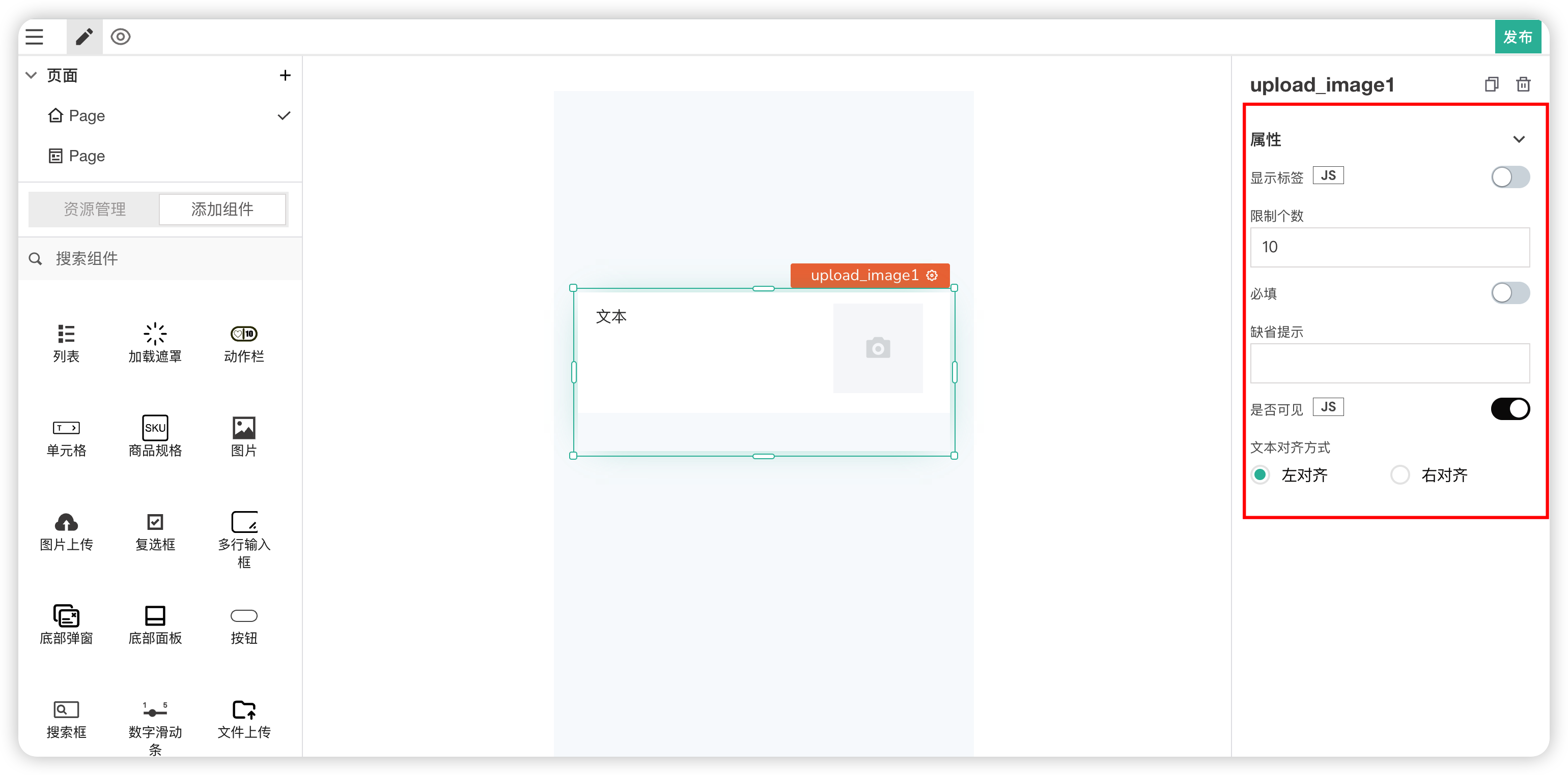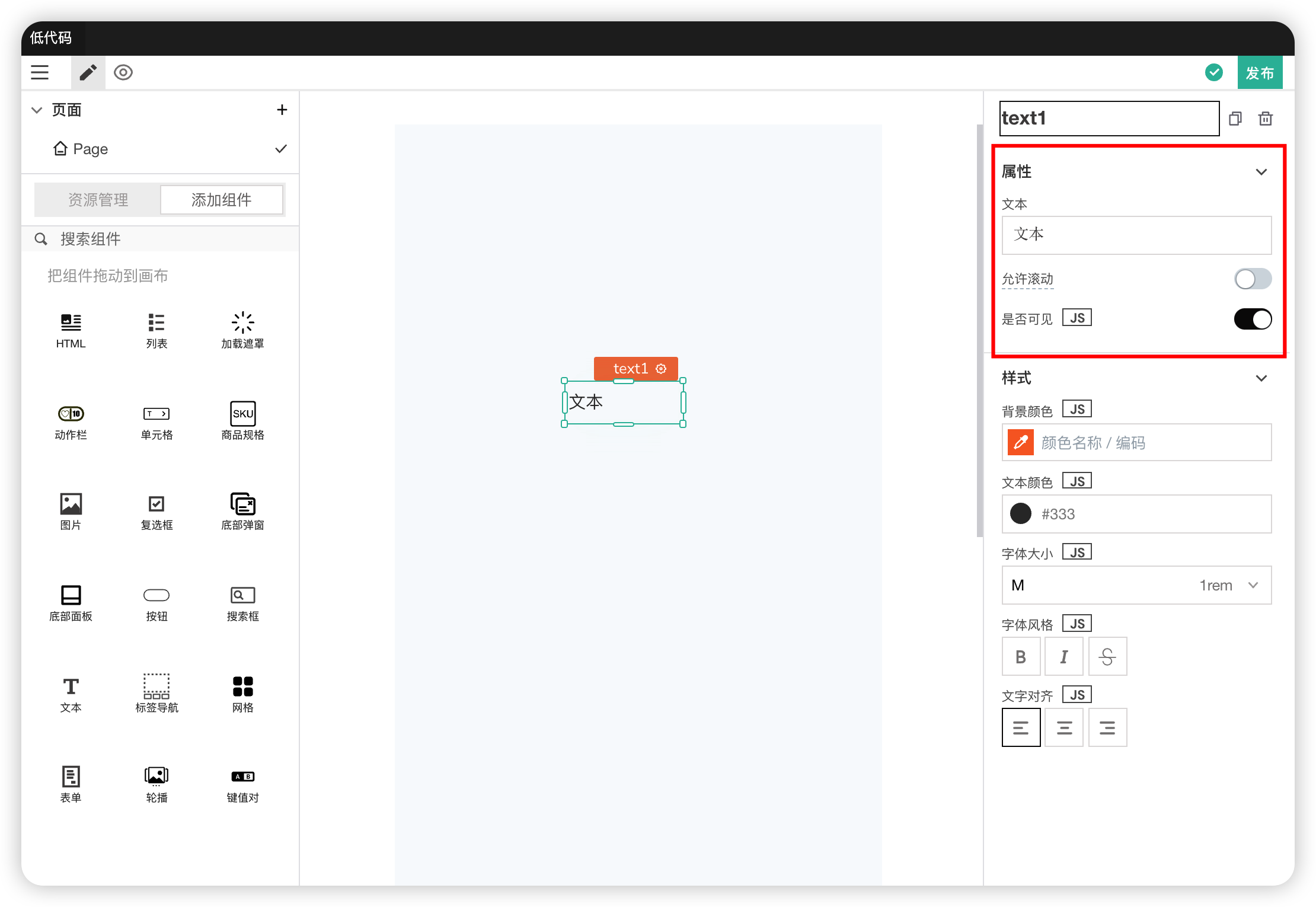 | 是否可见 | 控制组件在页面上的可见性。关闭时:当应用程序发布时,组件将不可见。在编辑模式下它看起来是半透明的 |