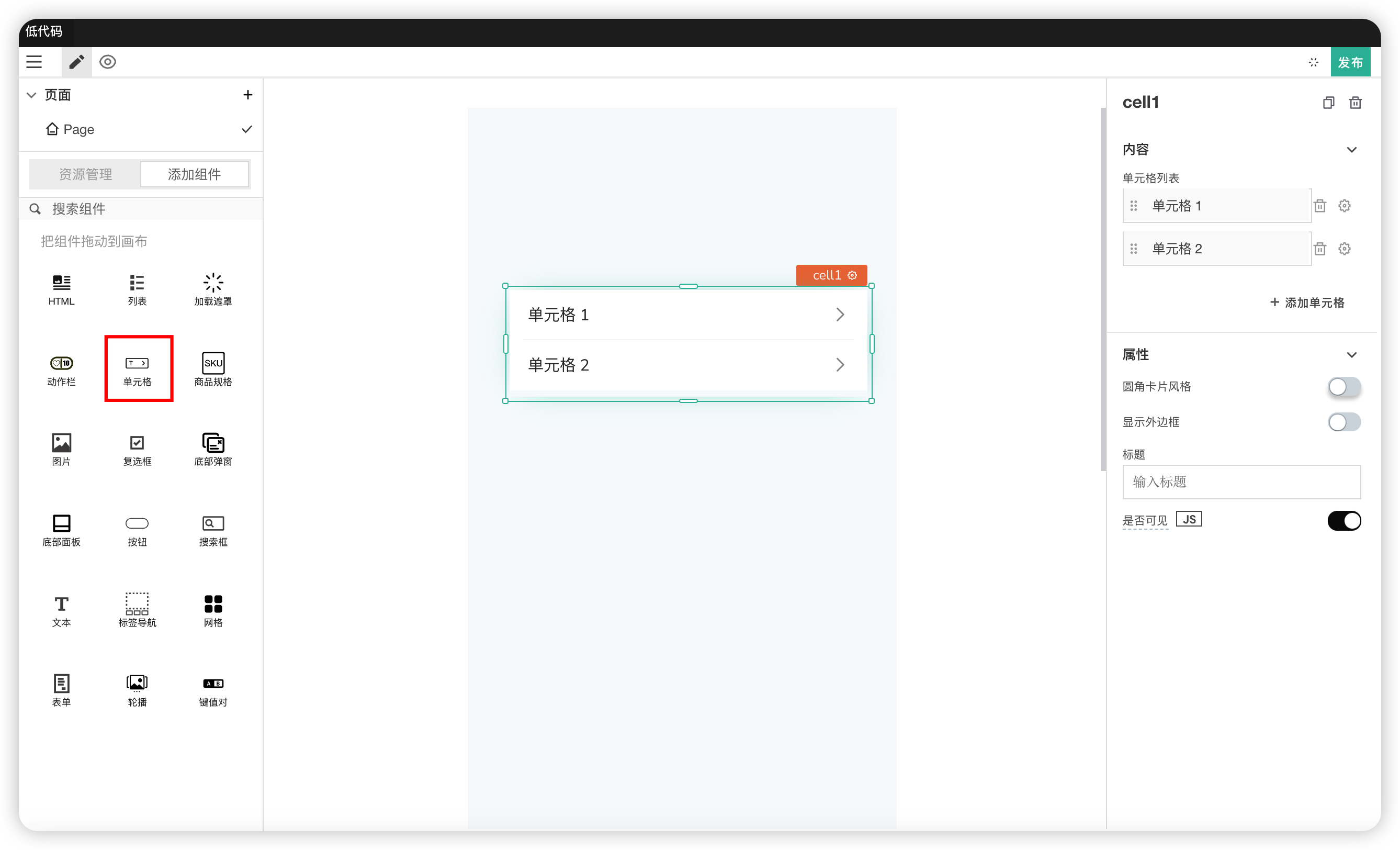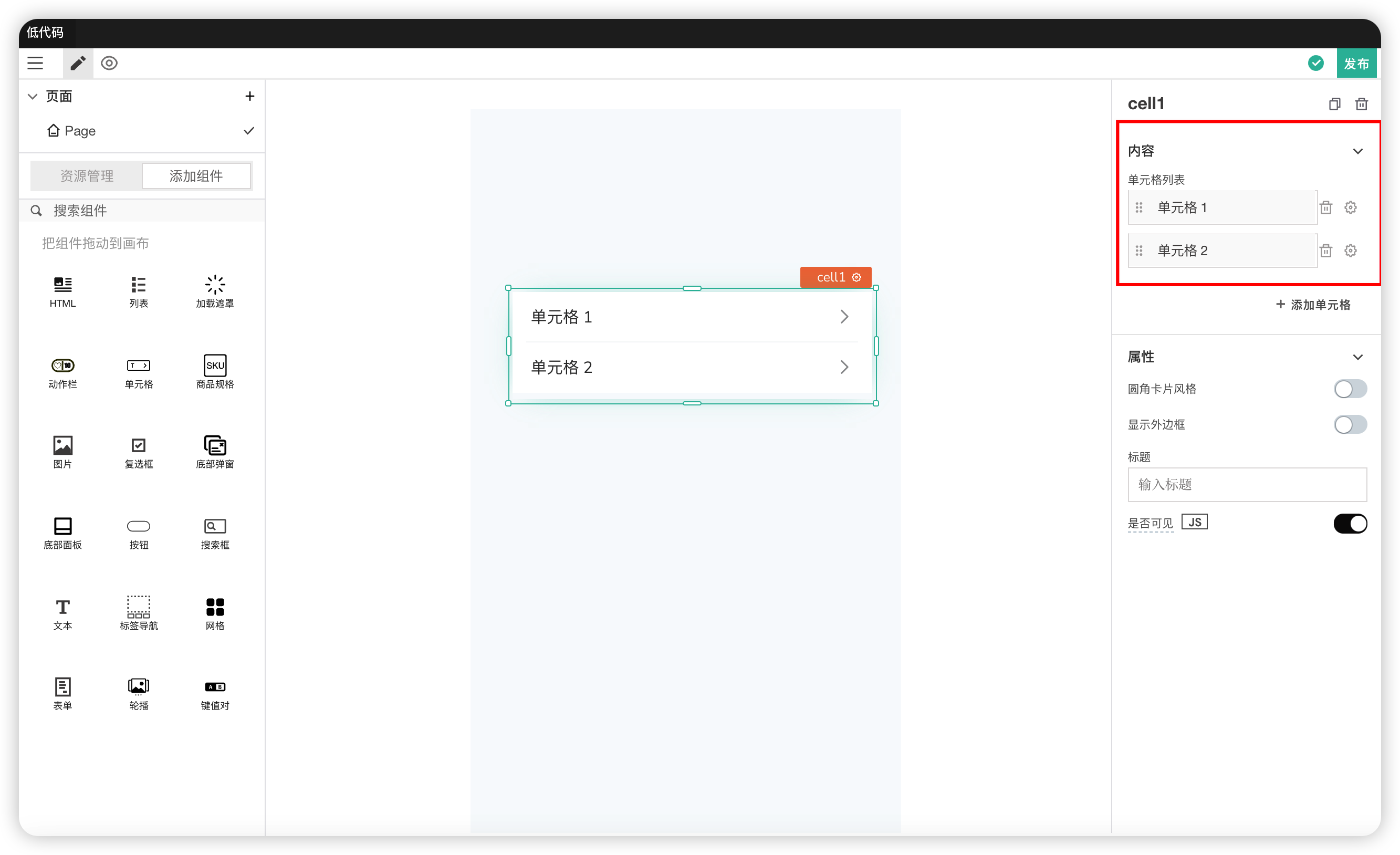| 单元格列表 | 单元格列表中的条目添加及单元格的配置,可通过点击右侧设置图标进行单元格配置 |
