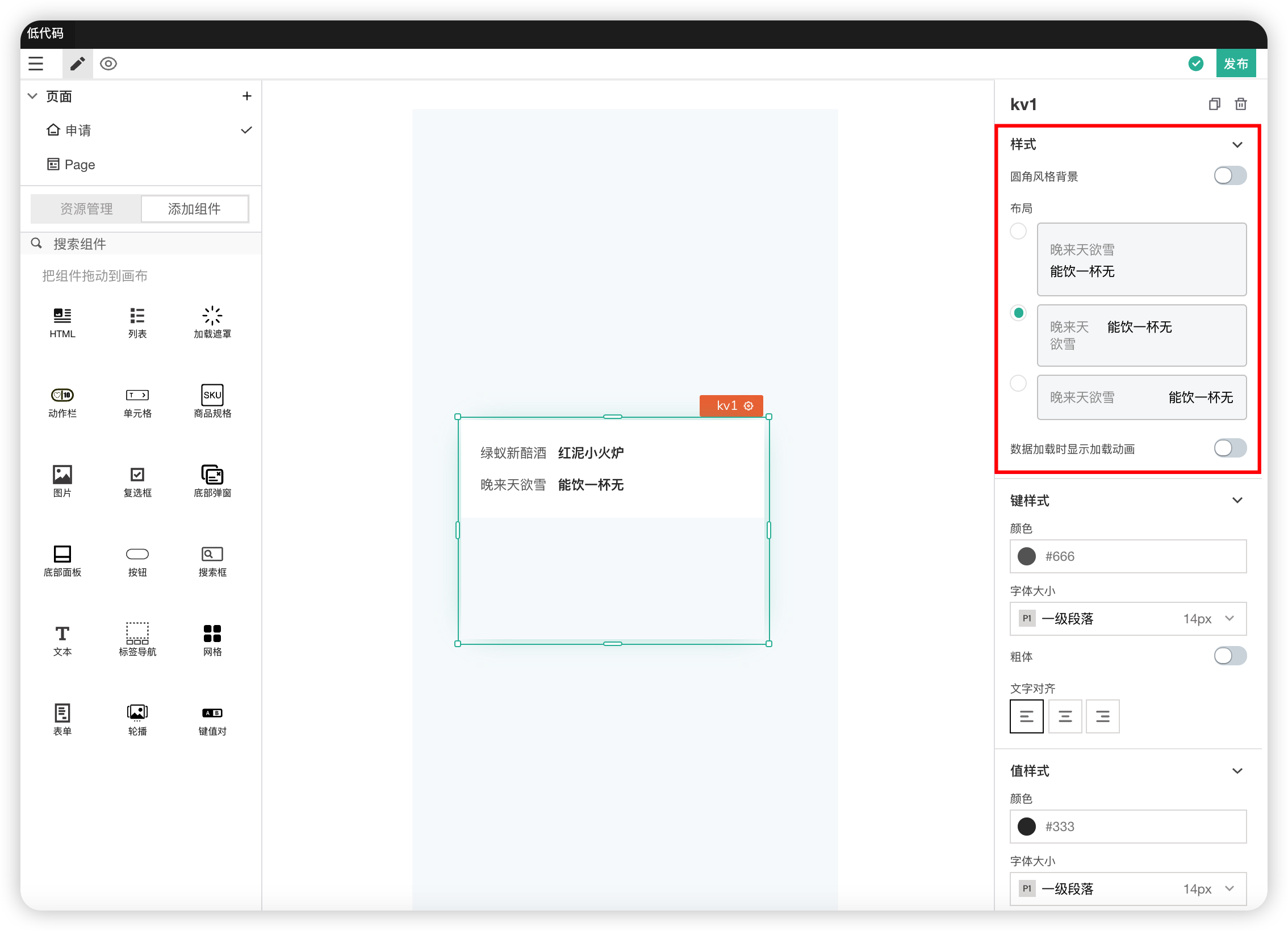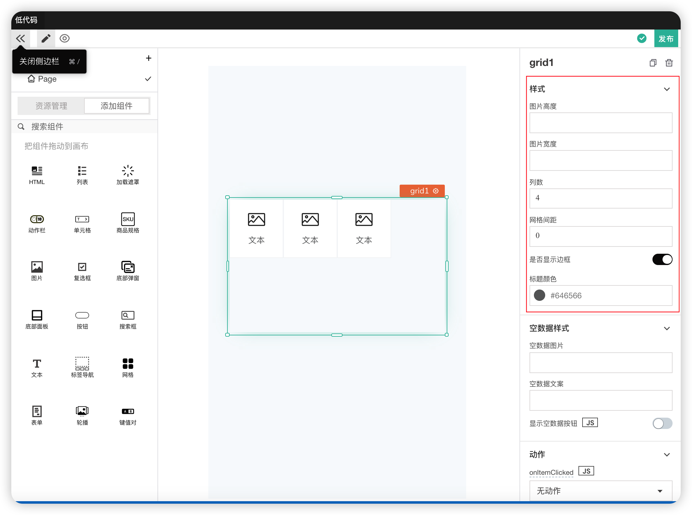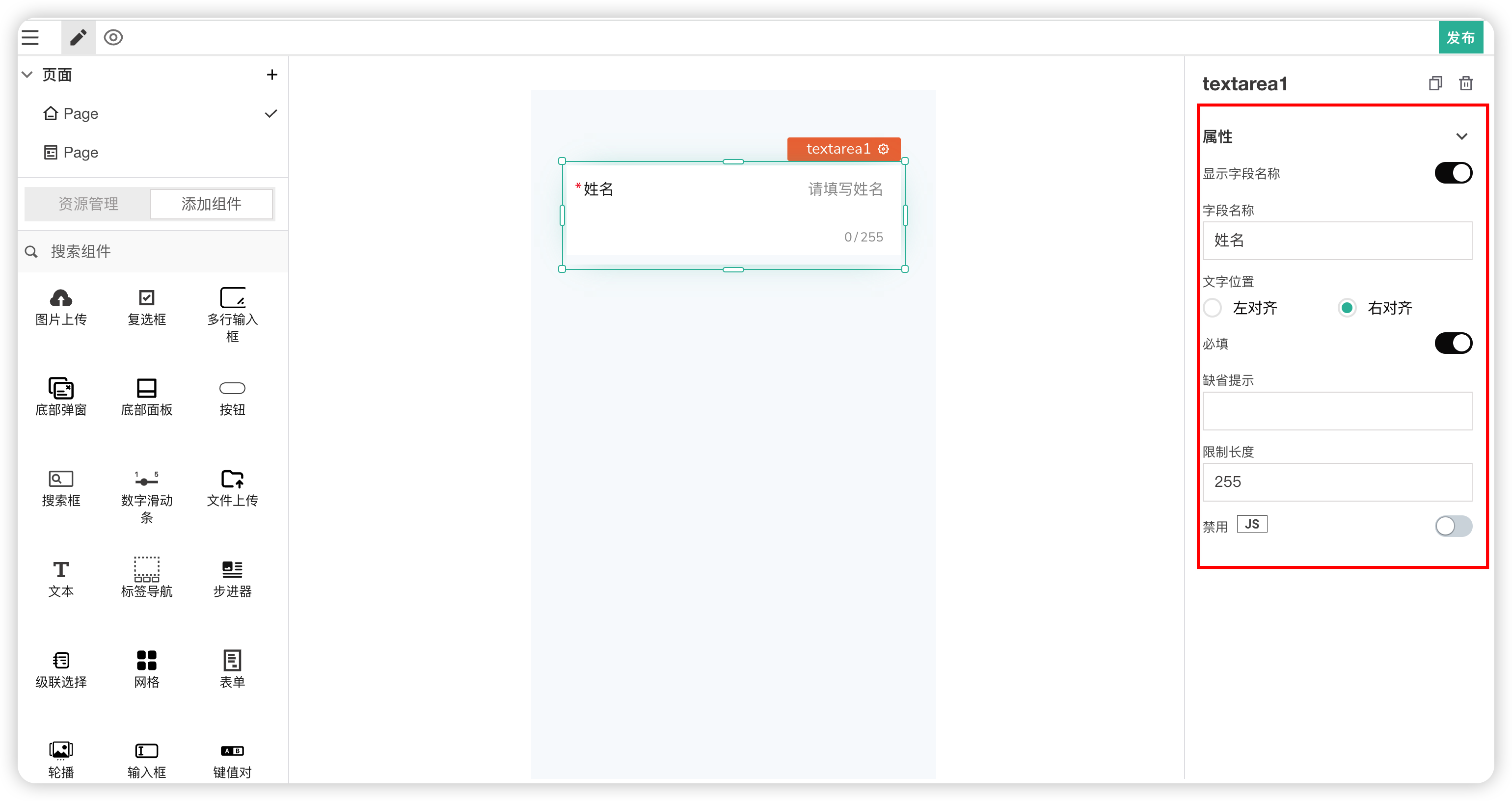 | 是否显示 | 控制组件在页面上的可见性。关闭时:当应用程序发布时,组件将不可见。在编辑模式下它看起来是半透明的 |