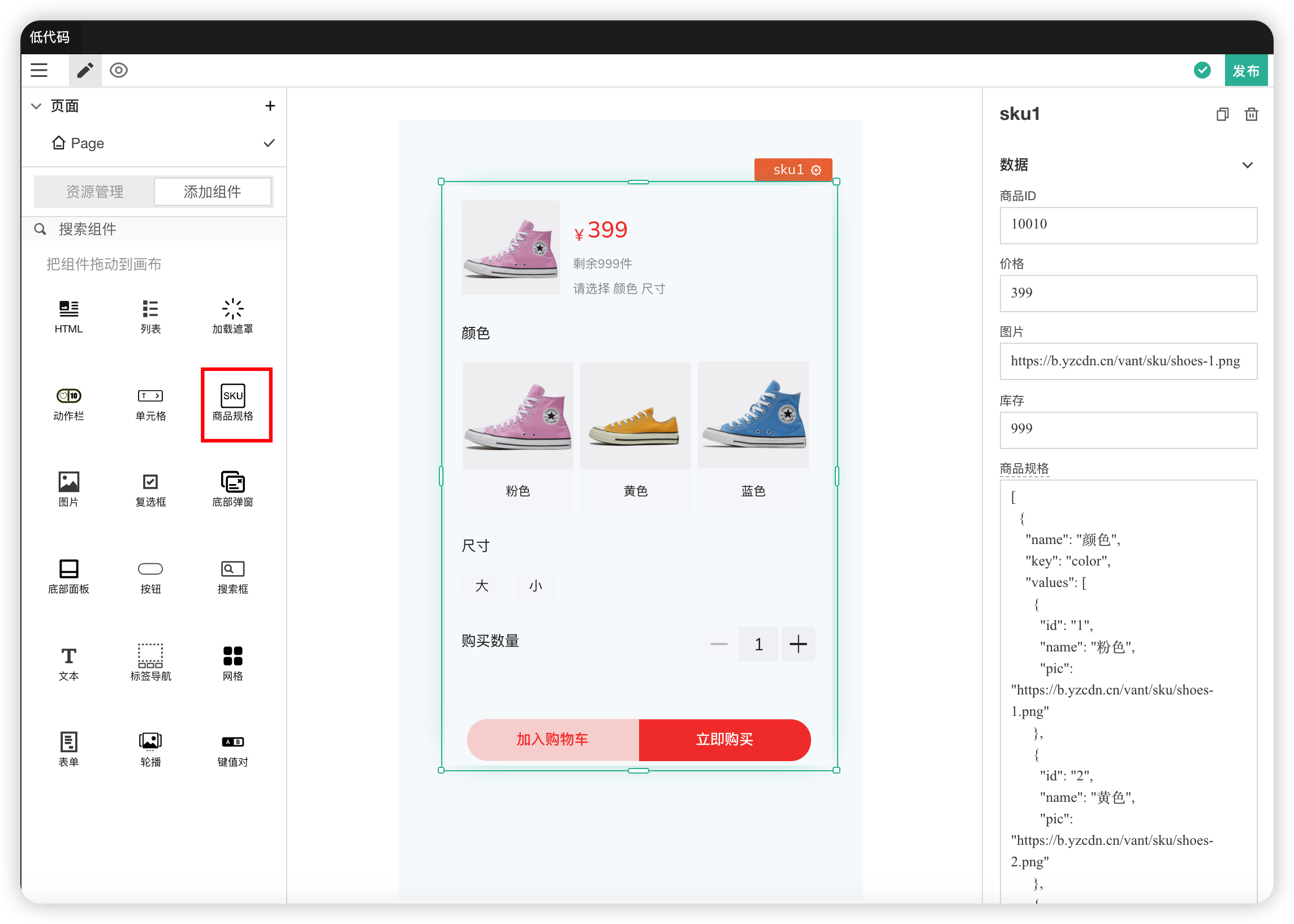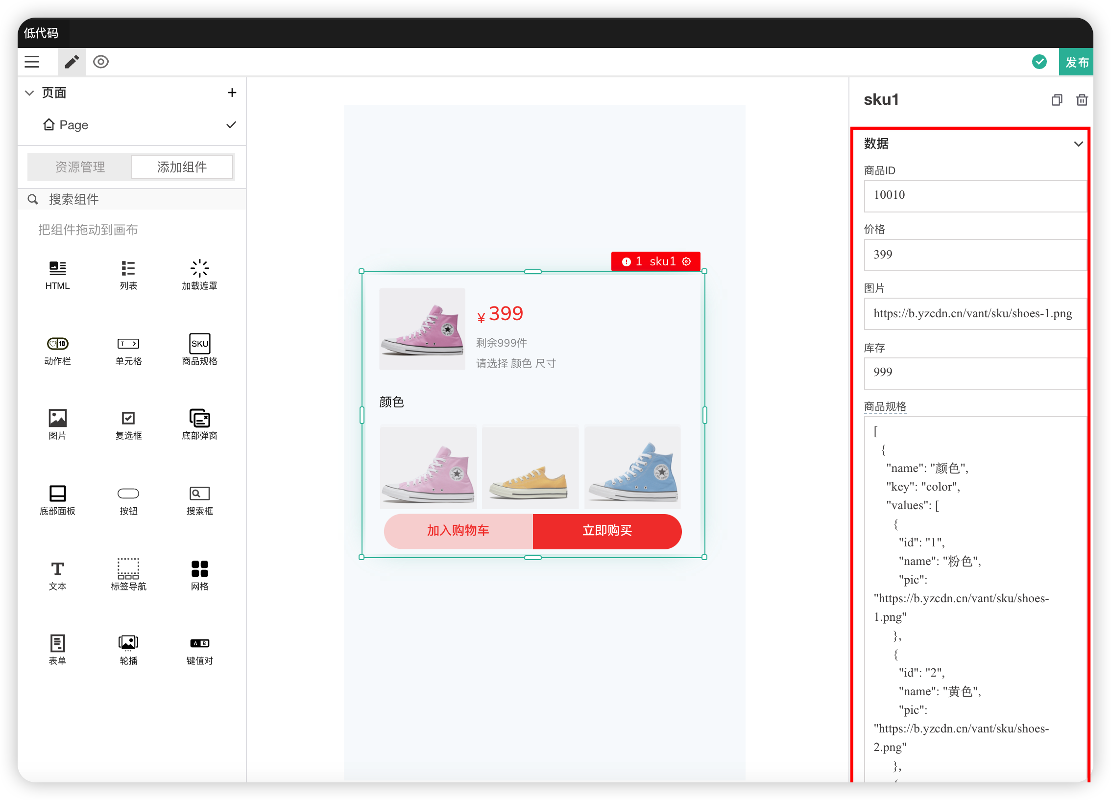 用于展示商品信息,包括价格、库存、商品展示等相关信息,同时可进行加入购物车和立即购买的操作