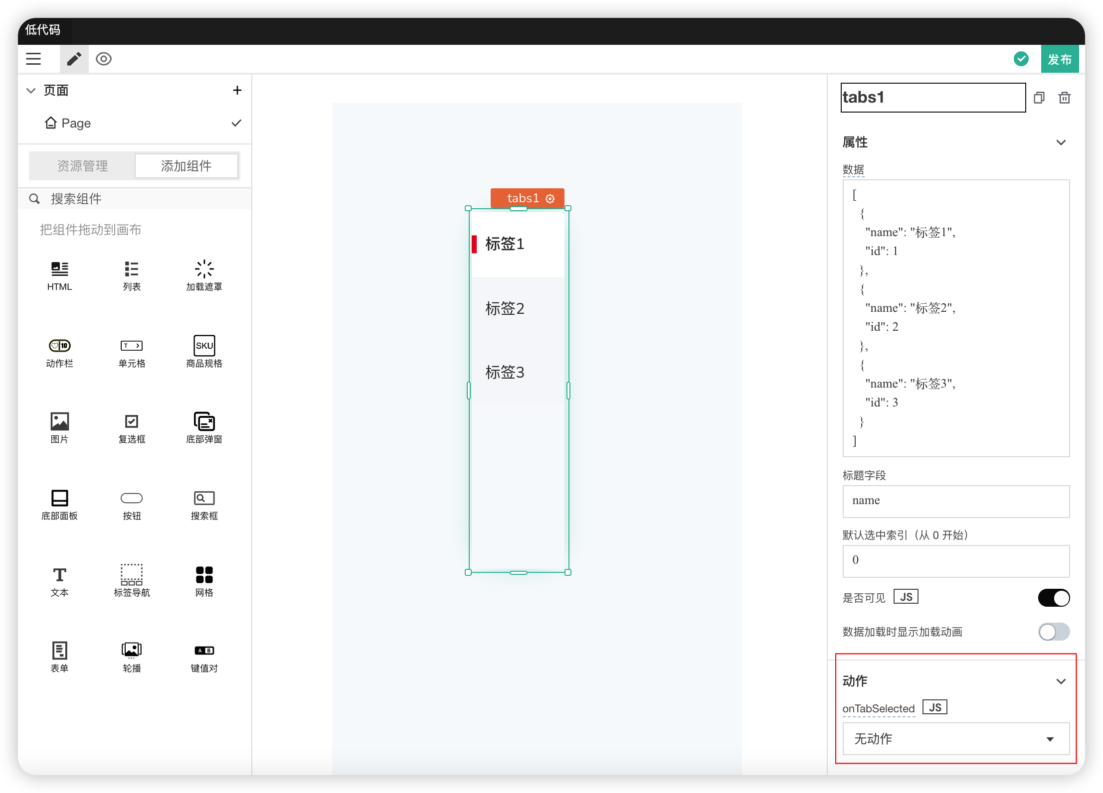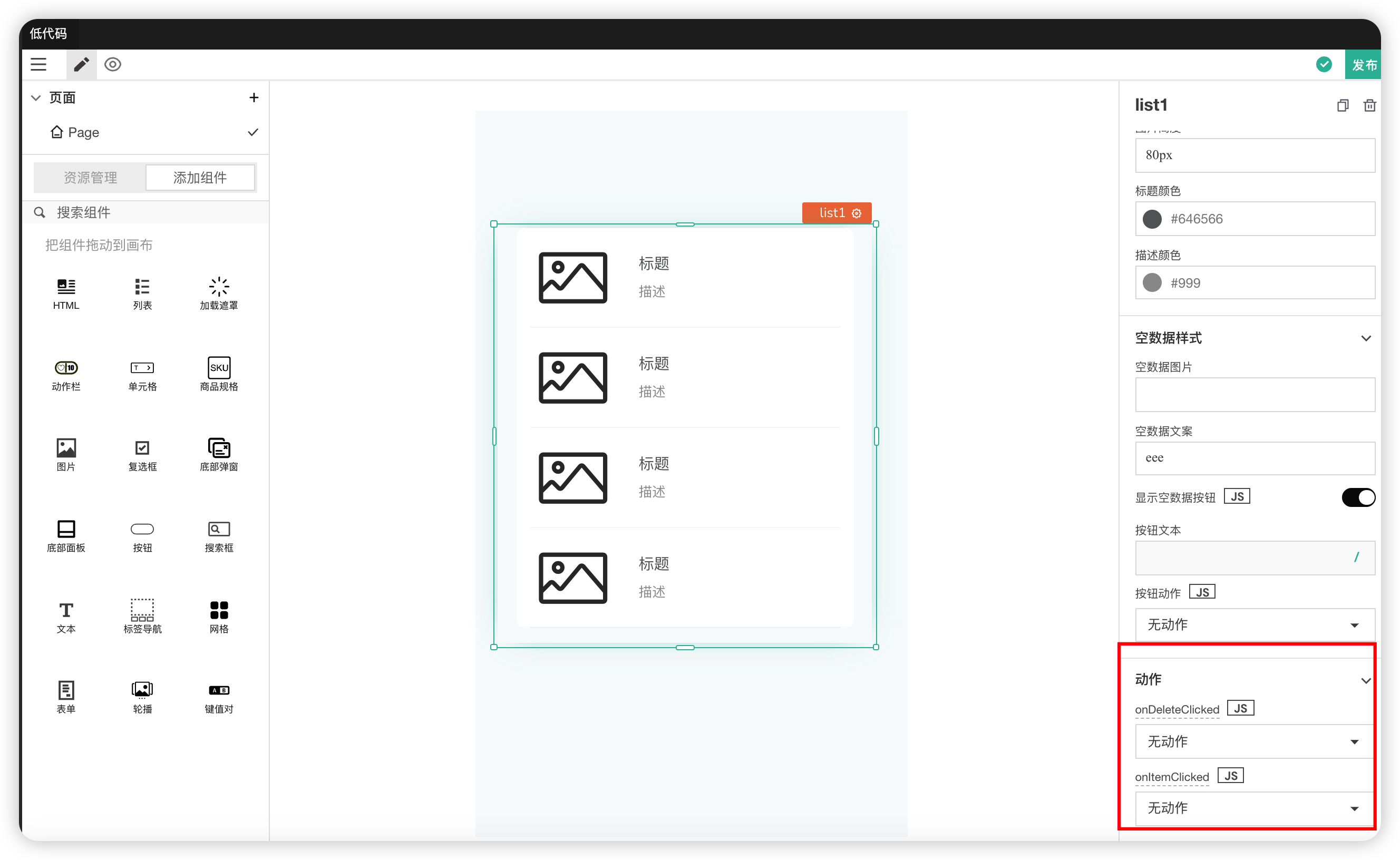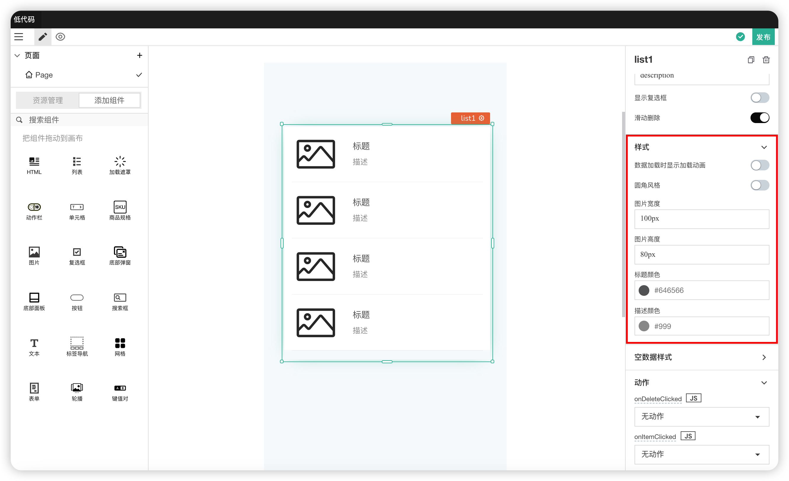 | 滑动删除 | 向左滑动列表,展示删除功能,可在动作模块中配置点击删除执行的动作 |