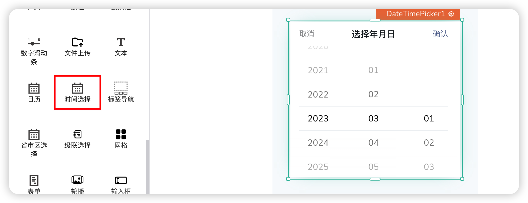 时间选择器,支持日期、年月、时分秒等维度,通常与弹出层组件配合使用。