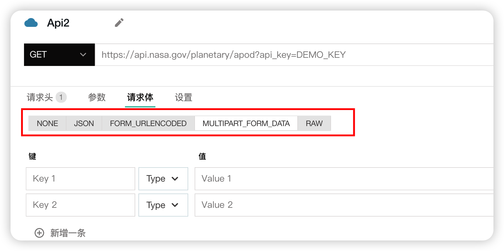请求头和参数,以key-value 的形式添加,请求体和设置请看下图
