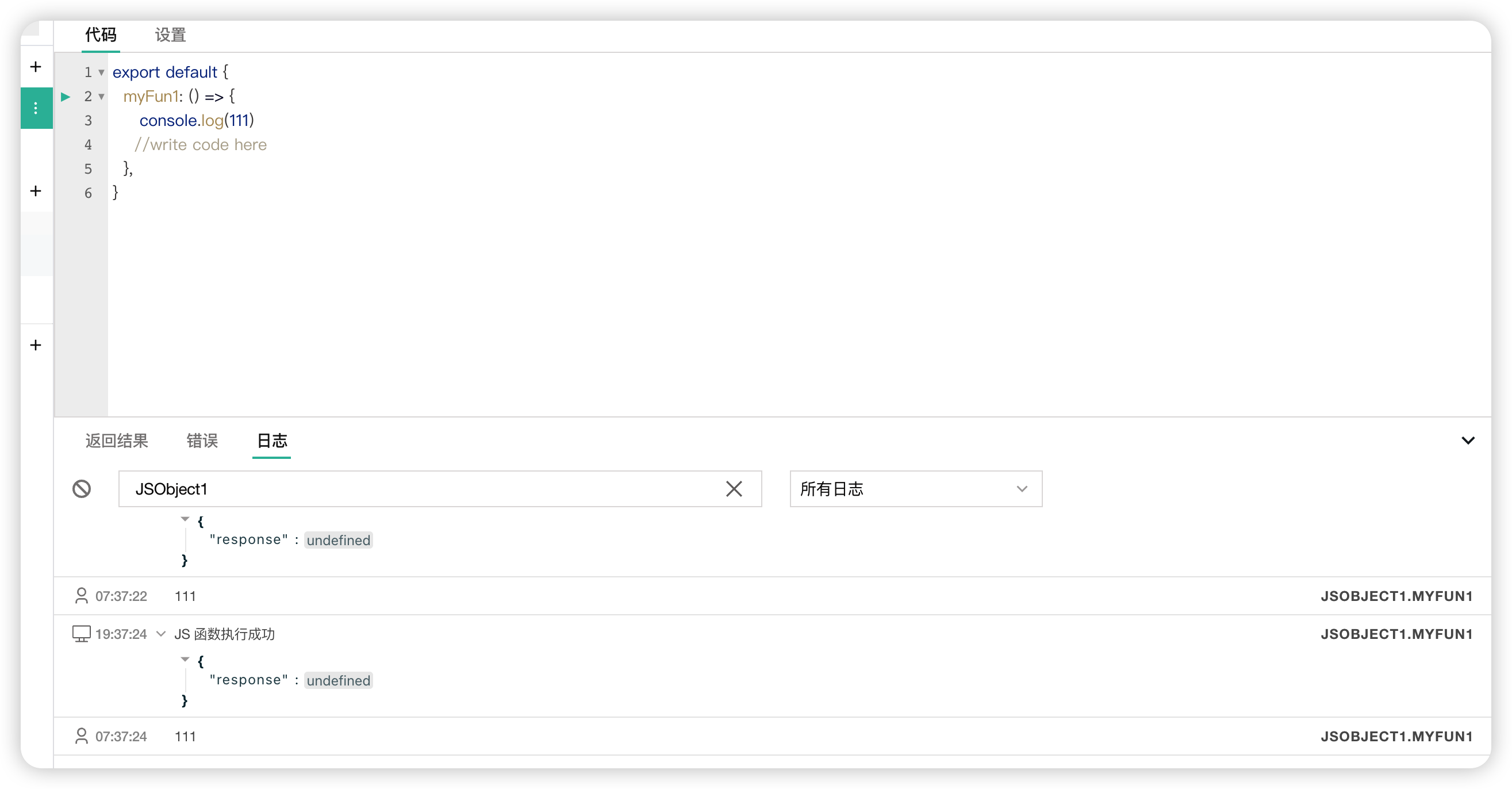 您可以点击右上角的运行可用来执行JS 函数。如果你的 JS 对象只定义了一个函数,编辑器会默认函数名。但如果您的 JS 对象定义了多个函数,您可以选择要执行的函数,然后单击运行。