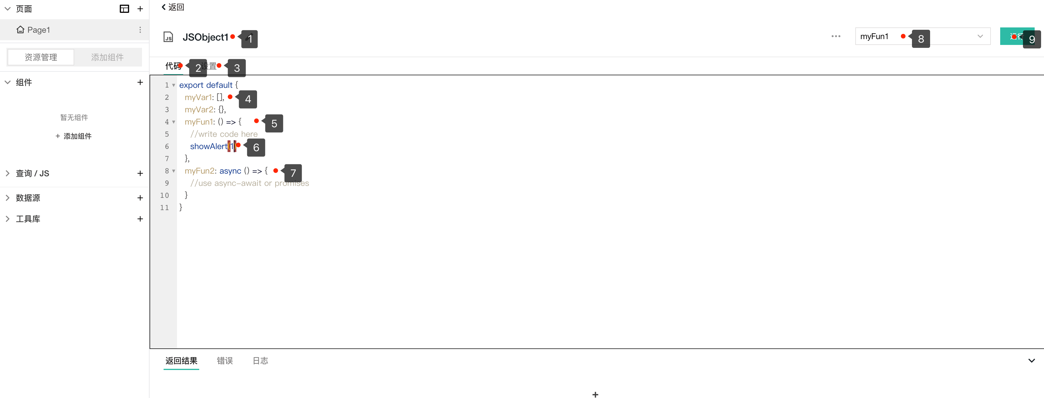 在低代码中的 JavaScript 编辑器允许您创建一个可重用的 JavaScript 函数,你可以在组件内调用这些函数,从而实现对应的功能。在低代码项目中,处处皆可JS。