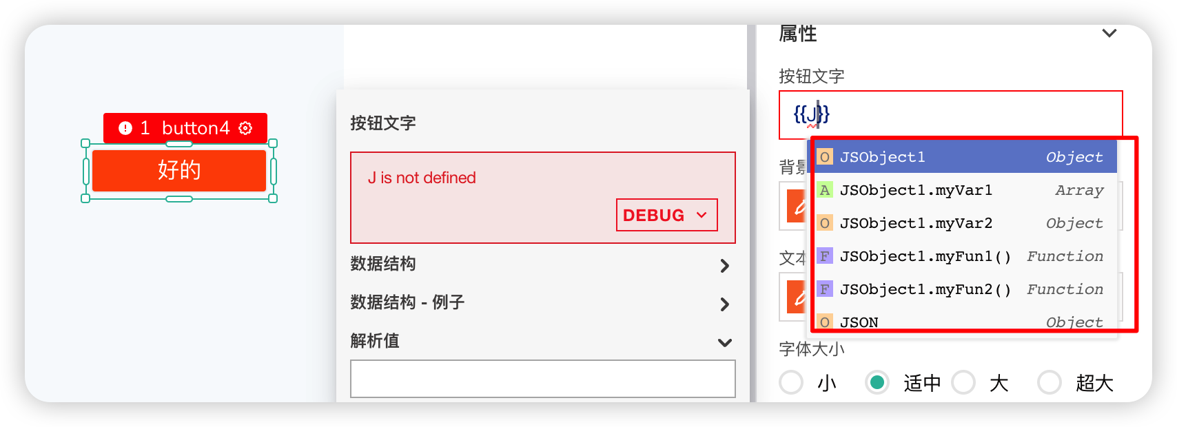 例如我们刚刚在上面创建了一个JSObject1对象,我们可以在任意组件中调用JSObject1对象中定义的函数,例如在按钮组件里面: