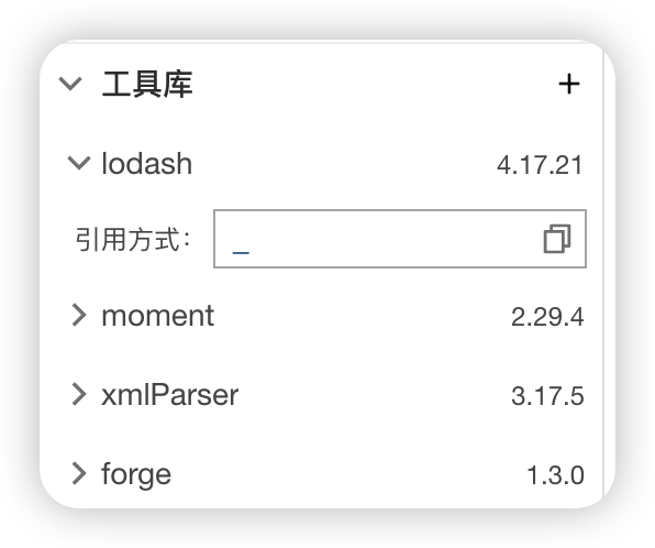 工具库中默认装载了 Lodash。Lodash 是一个一致性、模块化、高性能的 JavaScript 实用工具库。下面给出一些使用 Lodash 库的方法操作数组的示例,若您想要了解更多操作,请参阅 Lodash 文档。// 待做