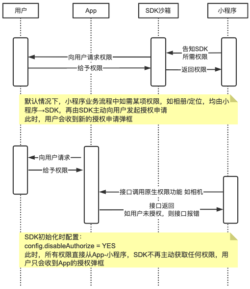除了将小程序 SDK 按照权限内容进行拆分,为满足不同 APP 的灵活设置需要,我们还提供了 “禁止SDK主动发起权限申请” 的设置入口。开发者设置后,SDK将无法主动向用户获取任何权限,所有权限均来源于APP的统一授权。