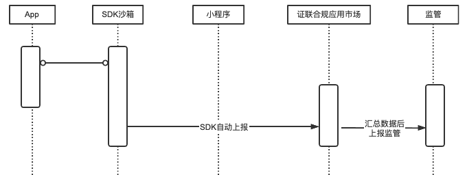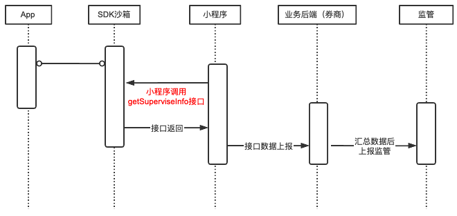getSuperviseInfo接口,该接口以用户信息和设备信息为主,由小程序主动调用,数据流向为:App→SDK→小程序→小程序业务后端,SDK 不做数据留痕; - 为实现行业合规应用市场留痕要求,SDK 须收集一定业务数据、并向行业合规应用市场进行上报,该类数据不涉及用户敏感信息,以小程序信息和 APP 信息为主,数据流向为:App→SDK→行业合规应用市场;