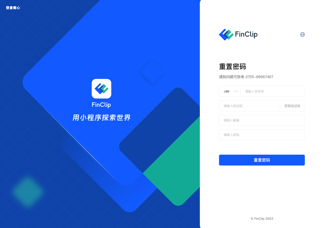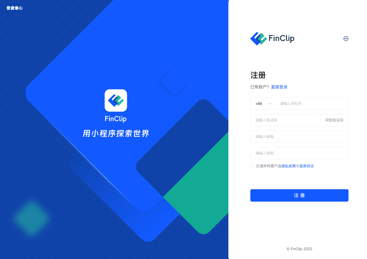 用户首次登录 FinClip 小程序开放平台时,需要先行完成账号注册工作。只有在完成账号注册后,才可以使用该账号登录进系统之中。