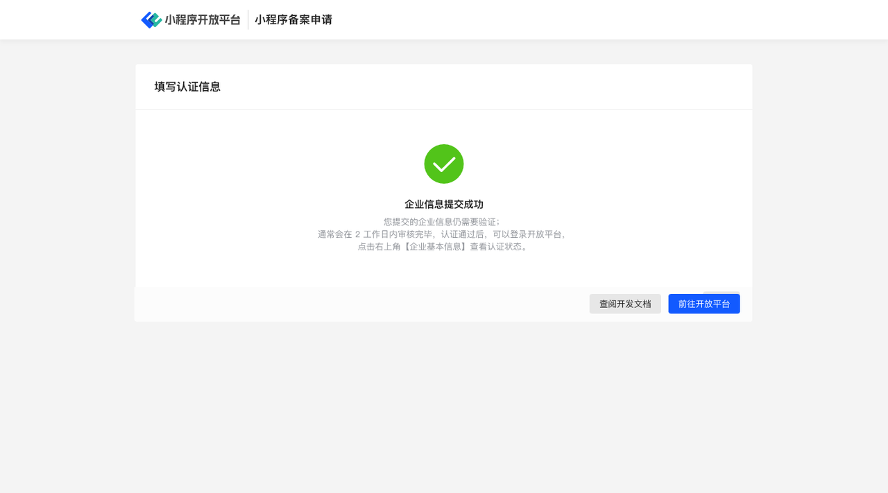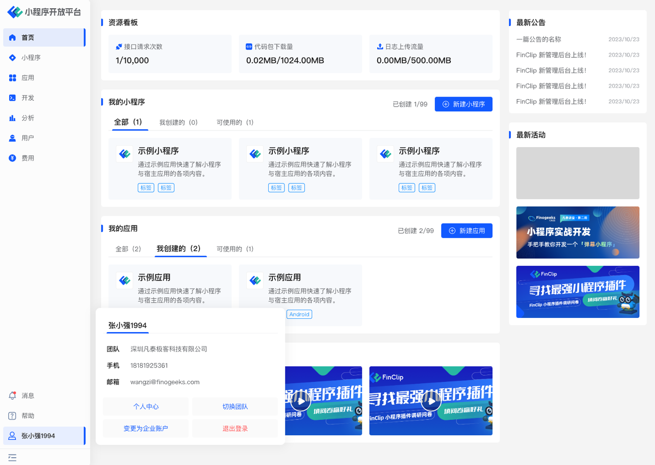 当您完成用户注册并登录平台后,会以“个人”身份进入 FinClip 小程序开放平台。以个人身份进行操作时可能会在如团队成员规模限制等场景遇到限制,此时您需要进行企业认证,即将当前的“个人”身份认证升级为“企业”身份。