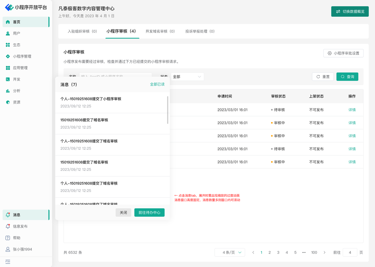 通过左下角「消息」菜单打开未读待办消息列表