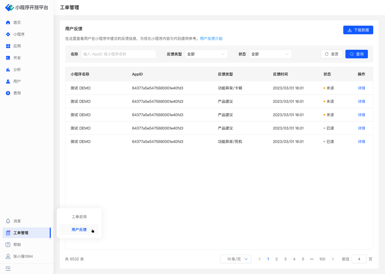 - 查看反馈:查看用户对于小程序的产品建议、功能异常反馈等