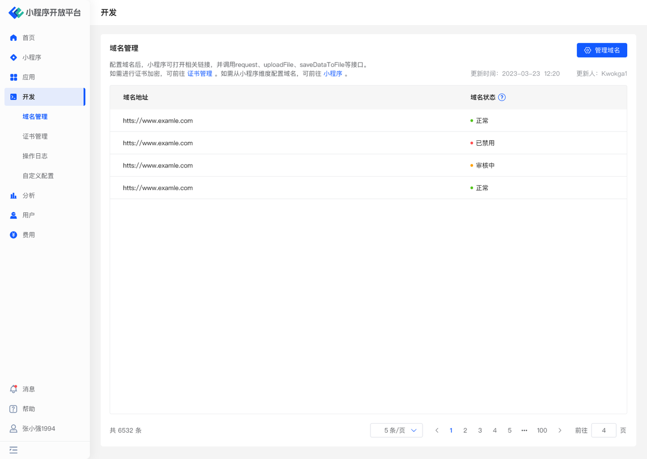 - 配置以组织为维度的域名:对所有小程序生效。如需配置以小程序为维度的域名须前往「小程序管理」