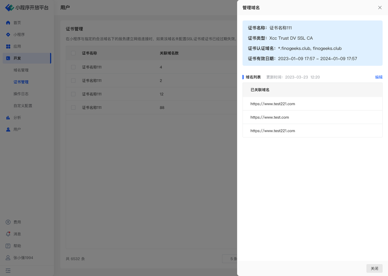 - 管理证书下关联的域名:将「域名管理」中的相关域名添加到证书下,也可从证书下删除相关域名。