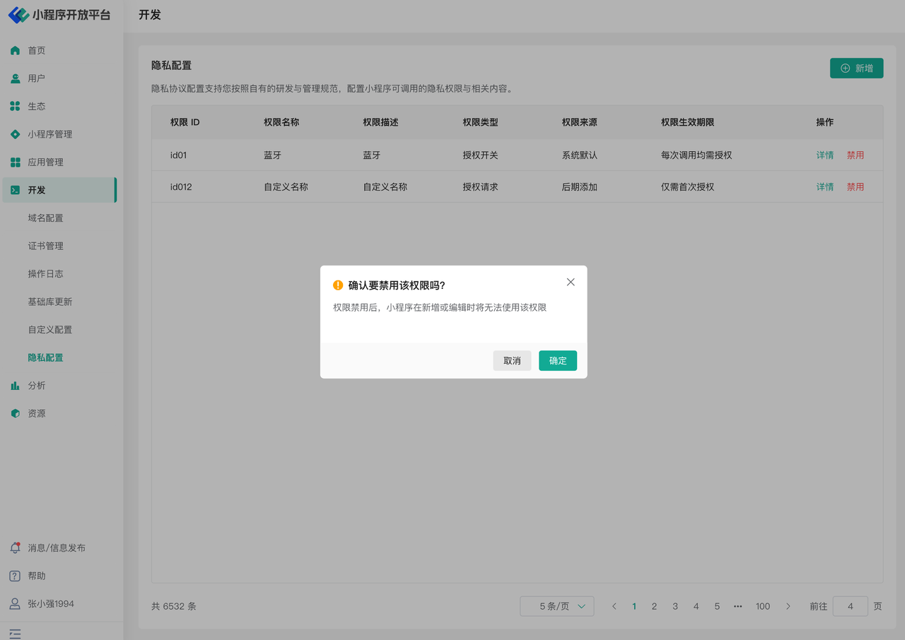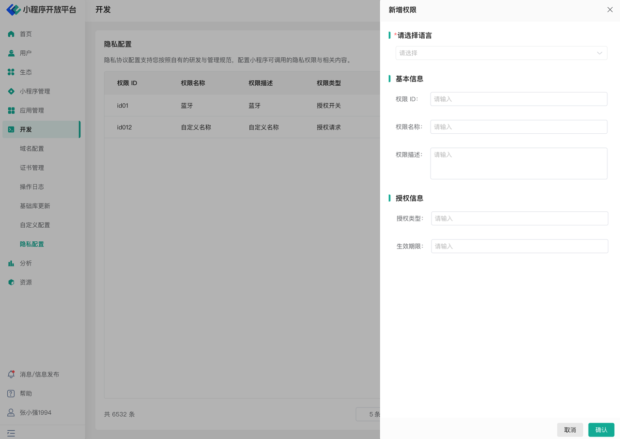 如果需要根据实际情况配置相关的隐私协议,则可以新增小程序中可用的隐私权限。