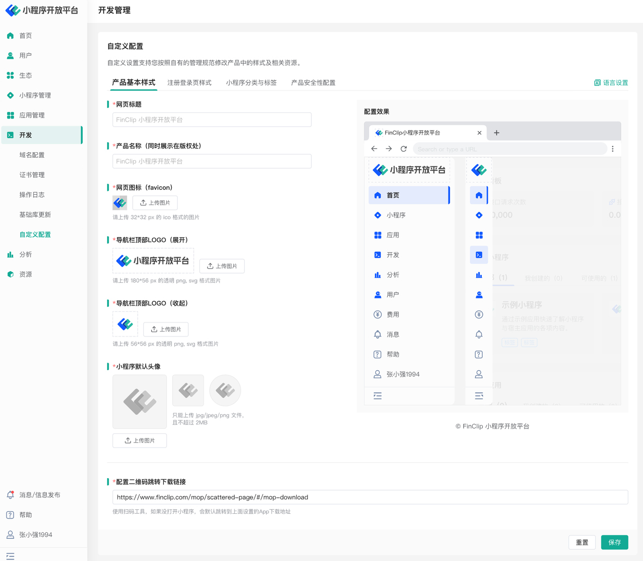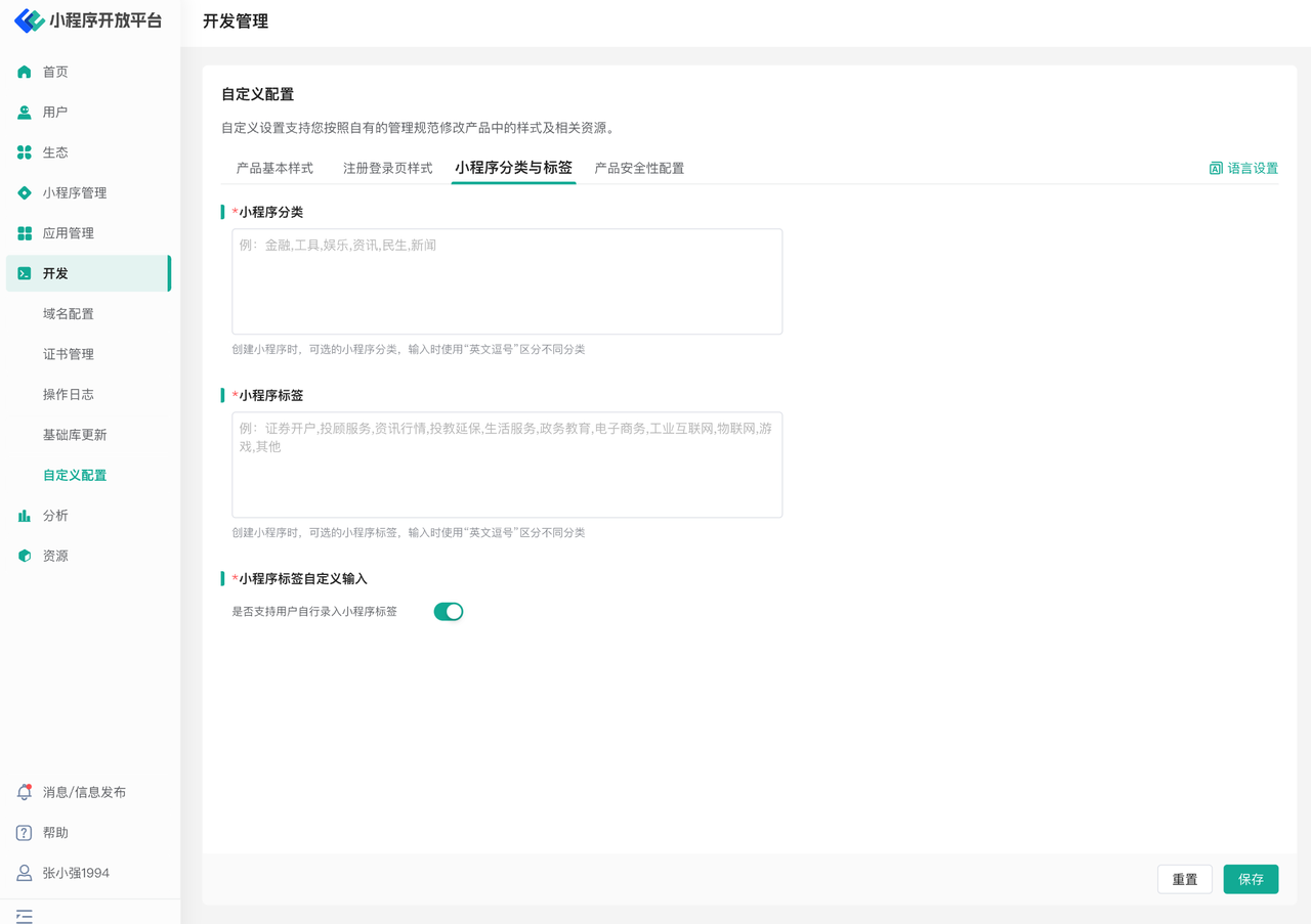 通过“开发-自定义配置”菜单即可进入自定义配置页面,页面中包括“产品基本样式”,“注册登录页样式”,“小程序分类与标签”及“产品安全性配置”四个选项卡。
