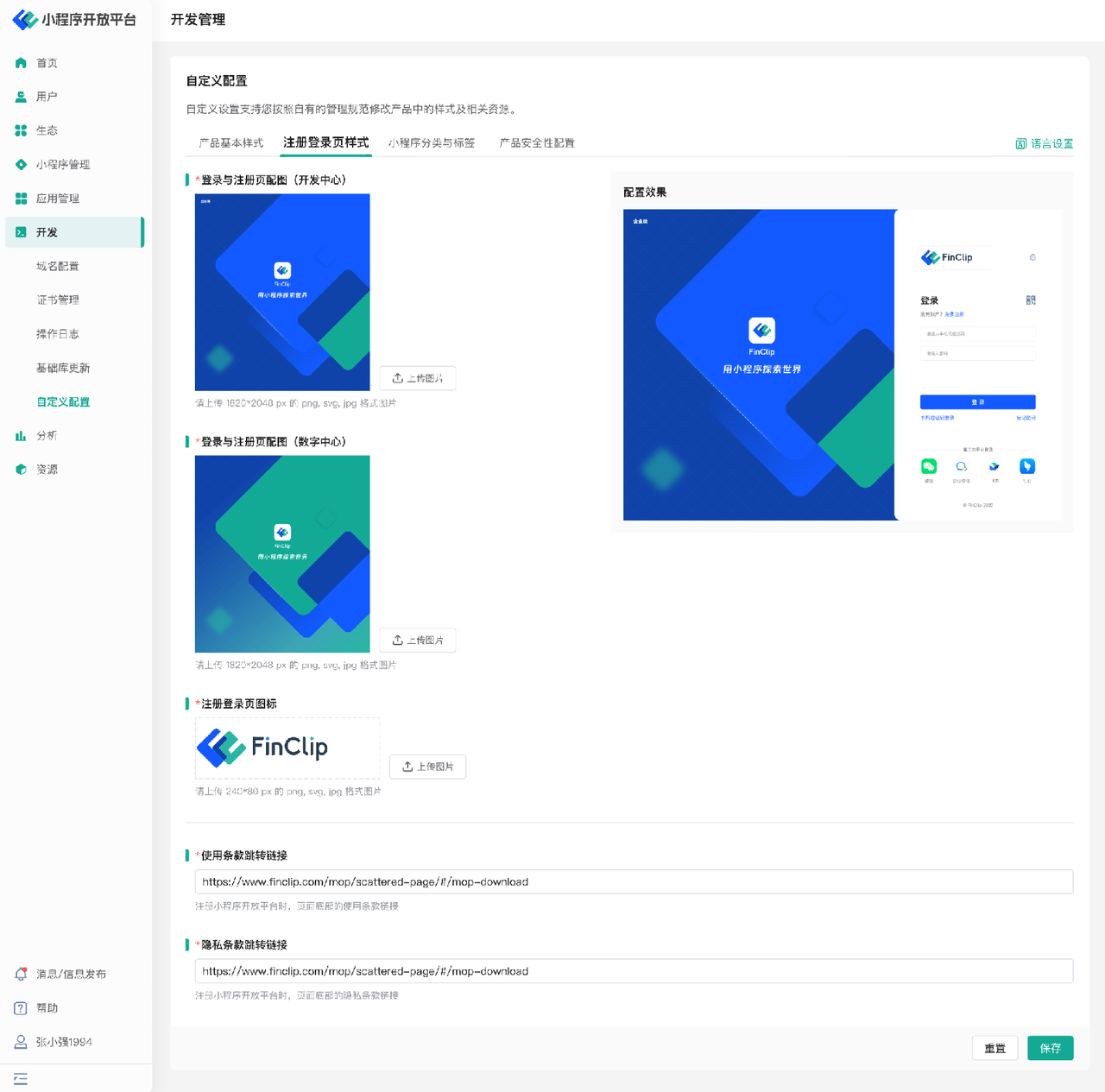 在注册登录页样式中,可以对小程序开放平台中的配图,产品使用条款和隐私条款跳转链接进行配置修改。