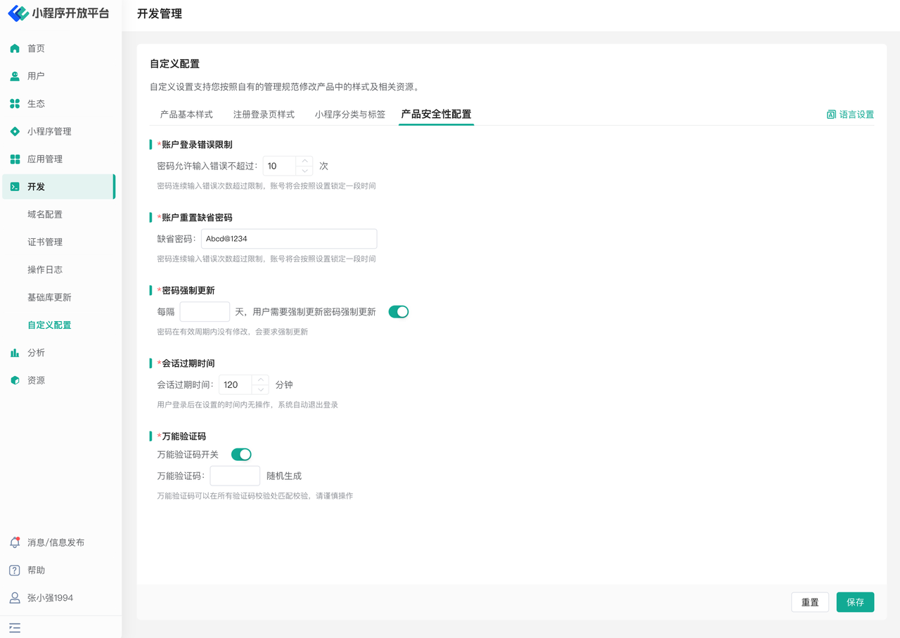 在产品安全性配置页面中,可以对平台中的安全性相关要求进行配置,如账户登录错误次数限制,账户重置默认密码,密码强制更新要求,会话过期时间与万能验证码开关。