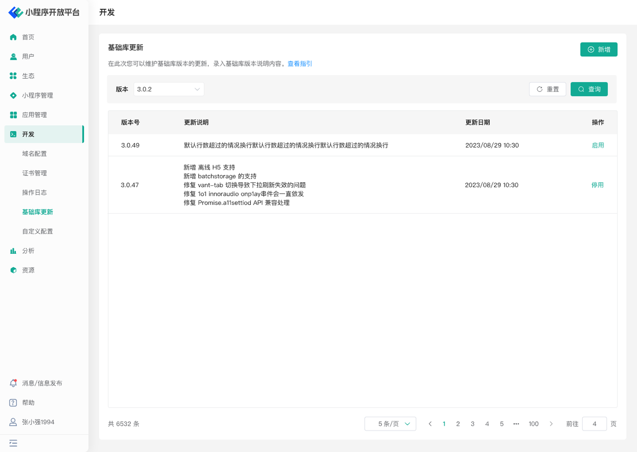 「基础库更新」是我们在数字中心中提供的一项功能,旨在帮助用户更方便地管理和更新小程序的基础库版本。通过这个功能,用户可以快速查看当前小程序所使用的基础库版本,并在需要的情况下进行升级或降级操作。这样一来,用户无需手动下载和替换基础库文件,也无需逐个检查和修改代码,大大简化了基础库的管理流程。