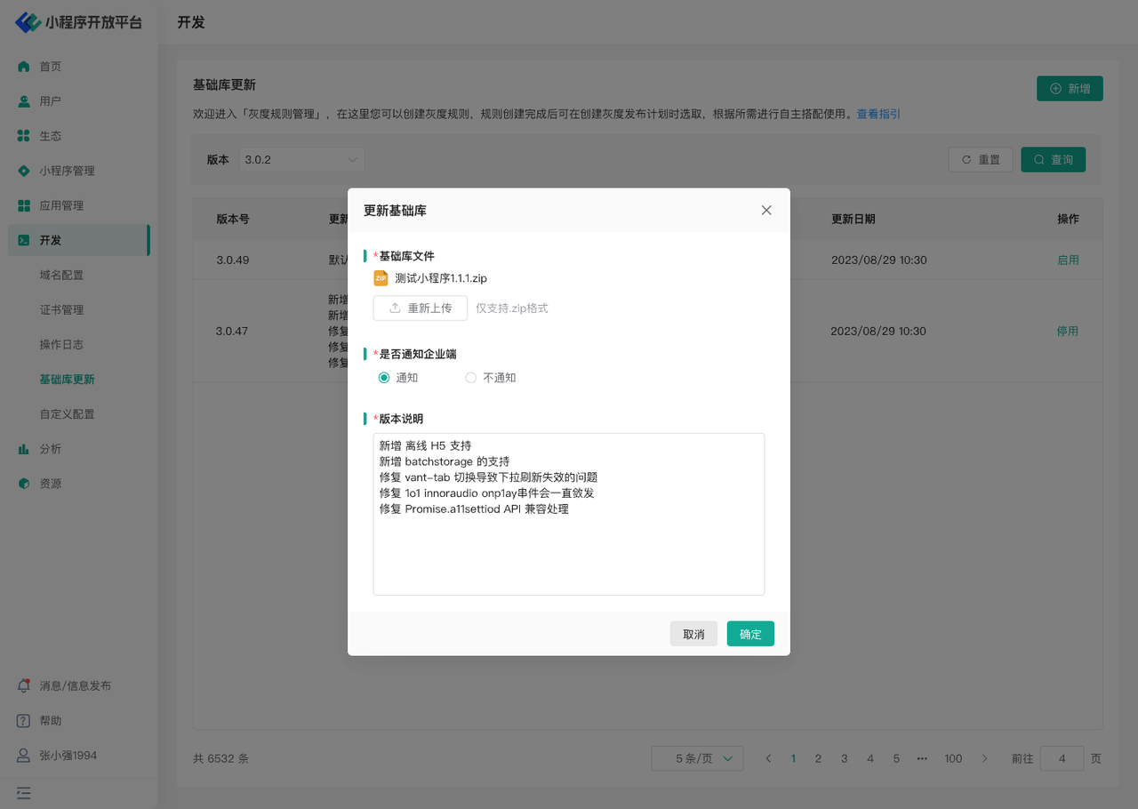 - 上传基础库时,只需选择基础库 zip 包即可,无需手动填写版本号 (服务端将自行从 zip 包中读取版本号)
