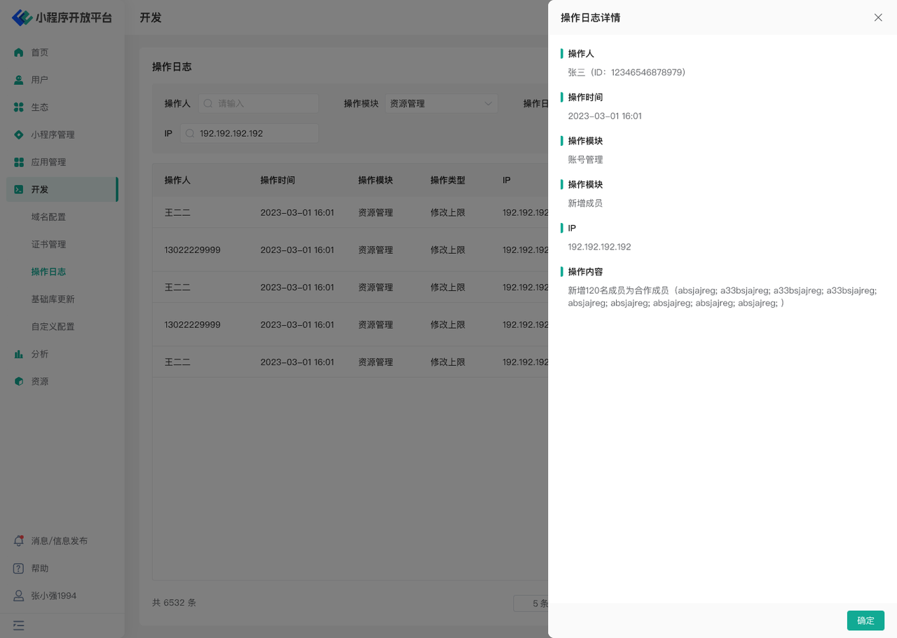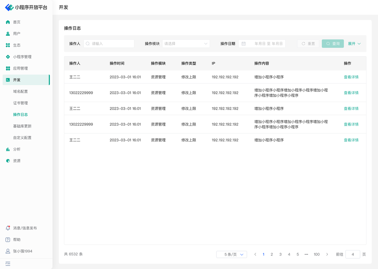 举例:如小 A 在「小程序管理」模块里新建了小程序,则操作人:小 A,操作模块:小程序管理,操作类型:新建小程序