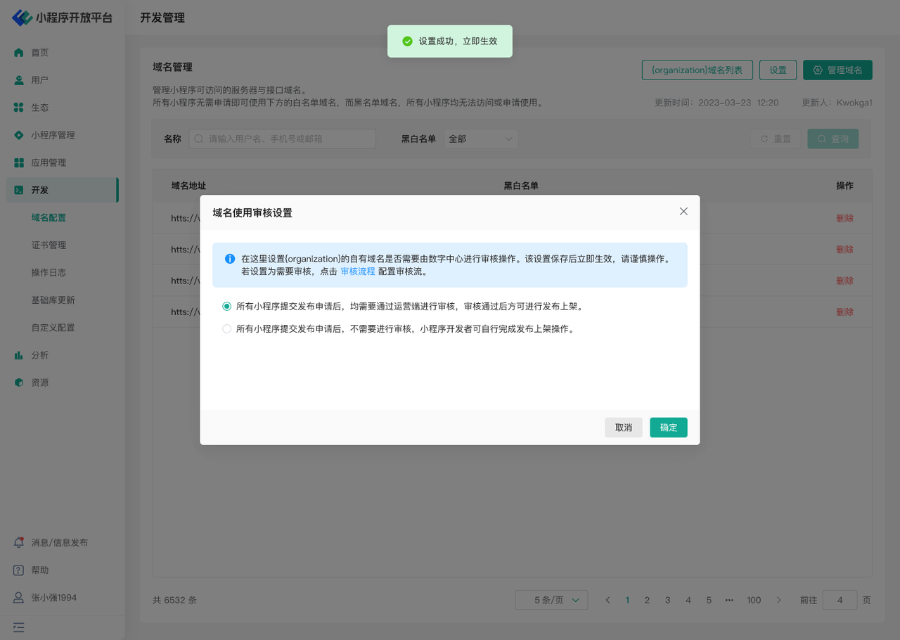 - 设置开发中心所有组织的域名使用是否需要由数字中心审核