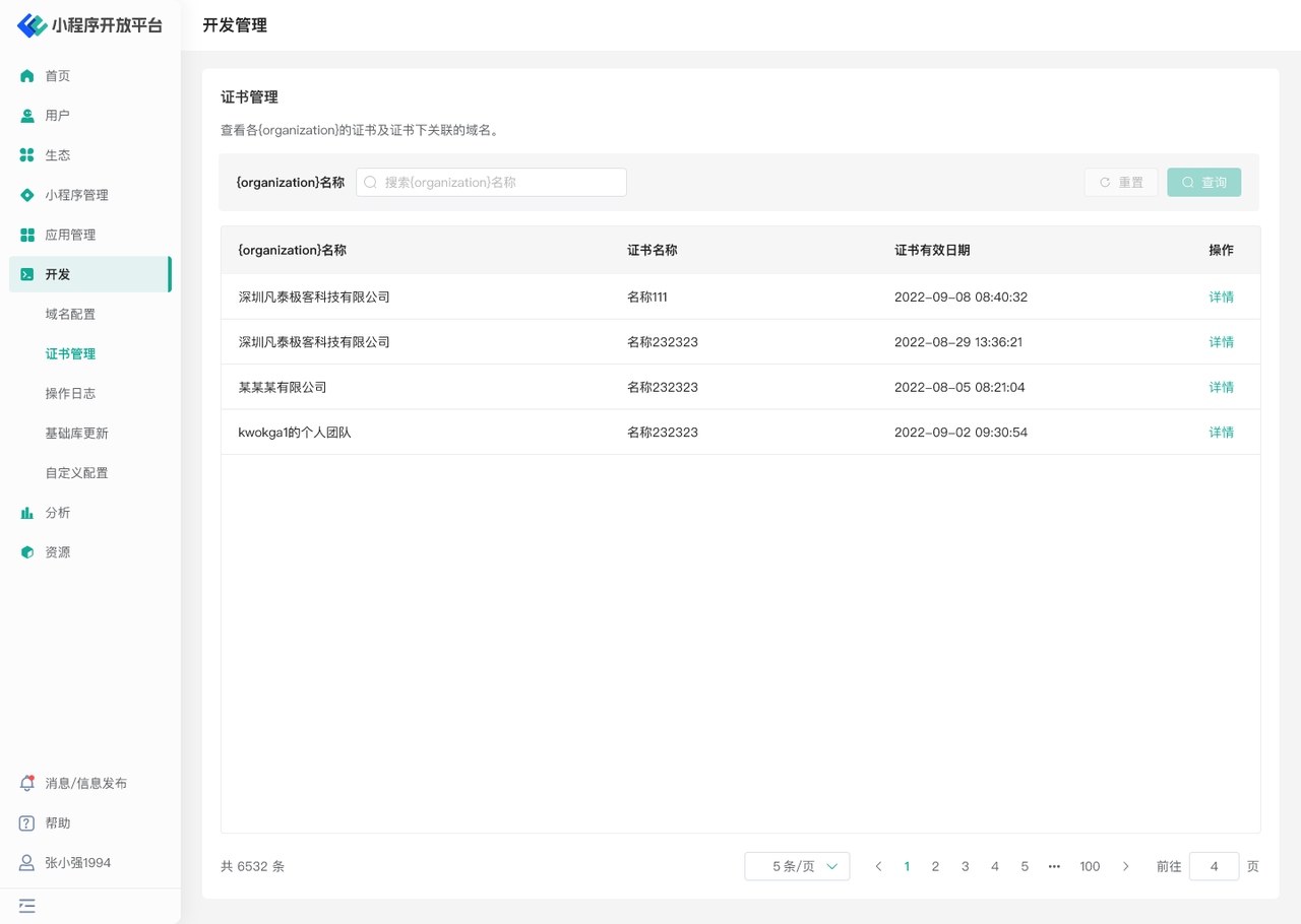 - 查看开发中心各组织的证书及其下关联的域名