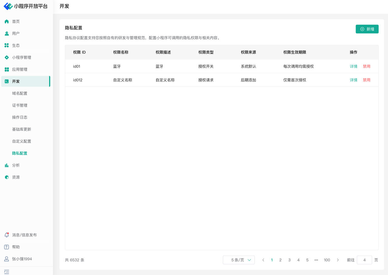 隐私管理功能主要用于帮助小程序生态平台运营方对小程序可调用的隐私权限进行更好的管理目标所设计的。平台方可以根据实际需要,对宿主应用中可能包括的隐私权限内容,隐私权限申请方式进行配置,从而进行更好的隐私权限管理工作。