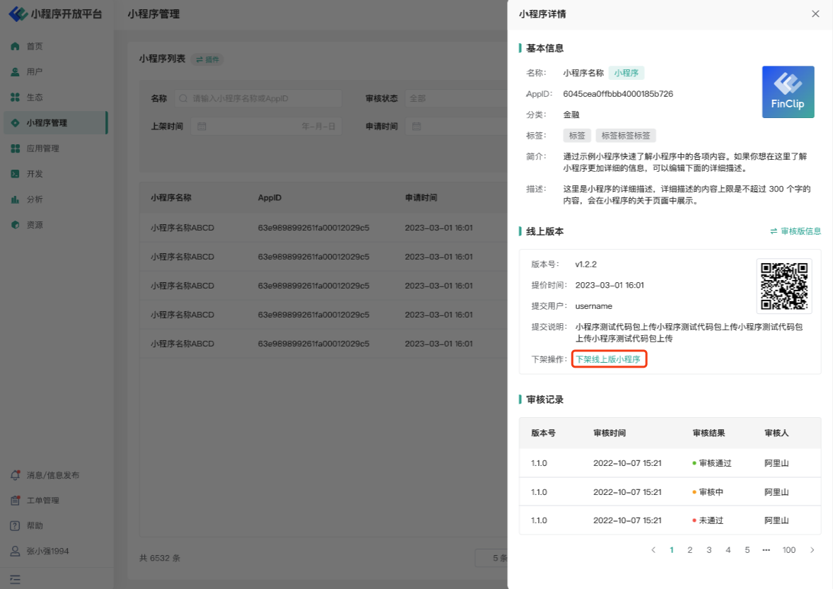 在小程序详情页中,您可以操作已上架的小程序,对其进行下架操作(上架审批则需要前往至待办中心),实行统一的管理。