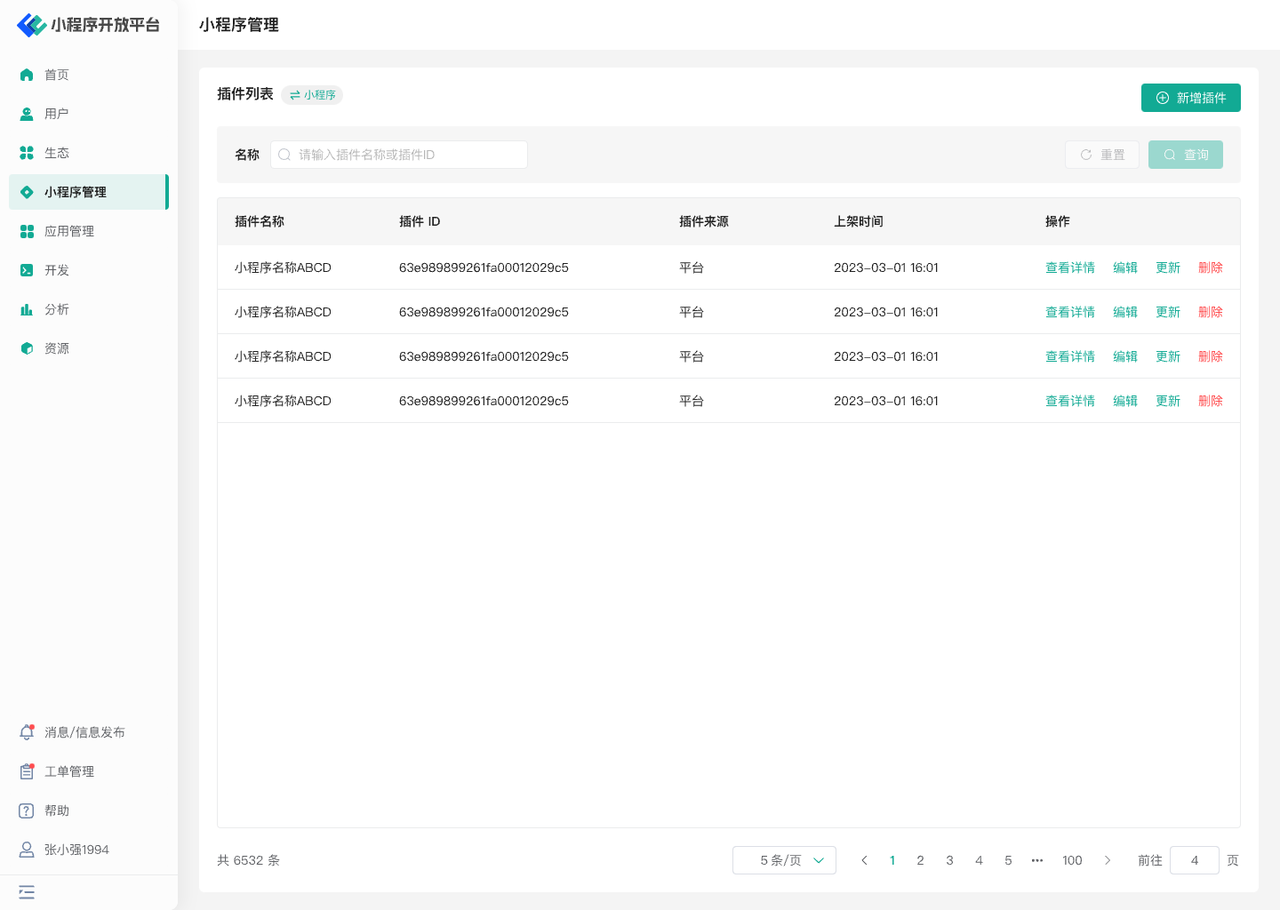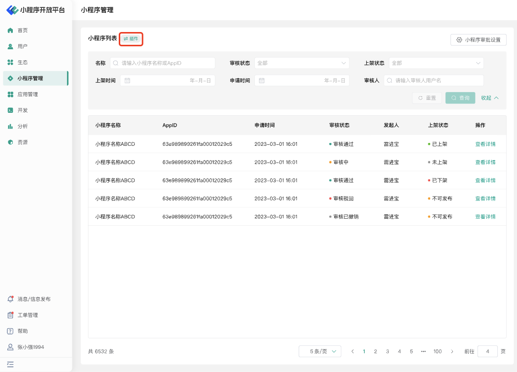 - 小程序管理列表提供全局的小程序信息查询,在此处,您可以通过相应的筛选组件搜索您需要了解的小程序信息,可以全面掌握小程序的基本信息、审核信息/线上信息、审核记录等,便于运营者能够进行精细化运营。