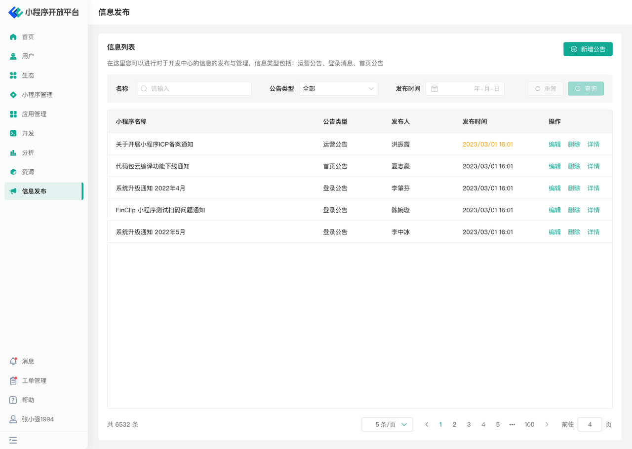 - 公告管理:对已发布、未发布的公告内容进行编辑,也可进行删除