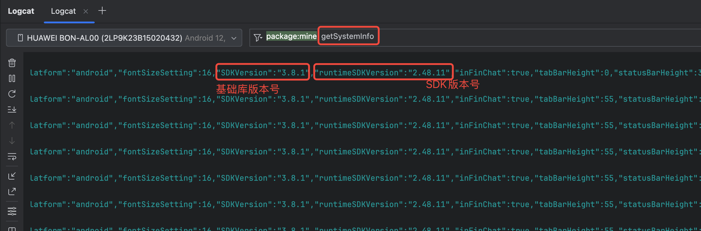 3、从android应用控制台内的日志中查看SDK版本号和基础库版本号