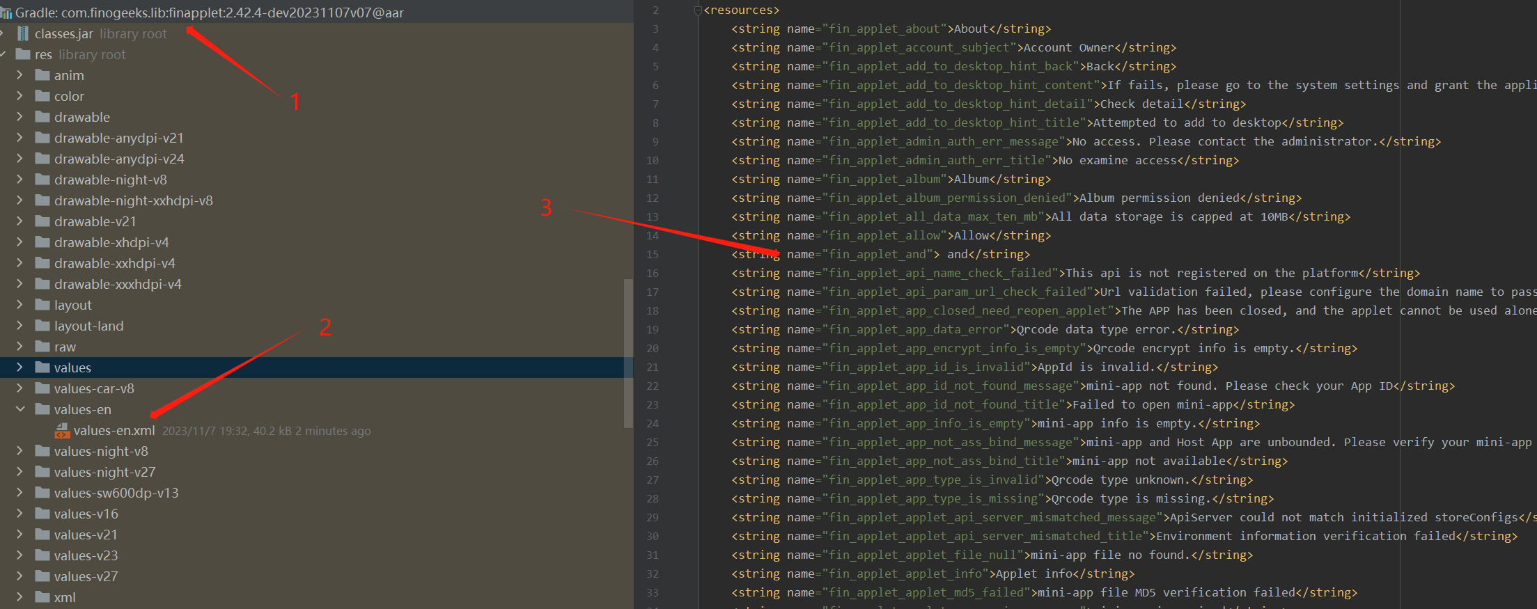 implementation 'com.finogeeks.lib:finapplet:2.42.4-dev20231107v07'根据下图找到项目中的核心SDK【finapplet】的aar文件,以及所有的英文资源文件,如图所示: